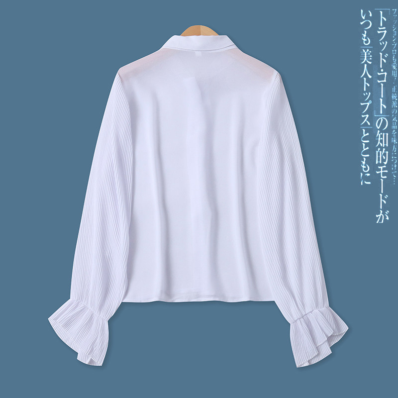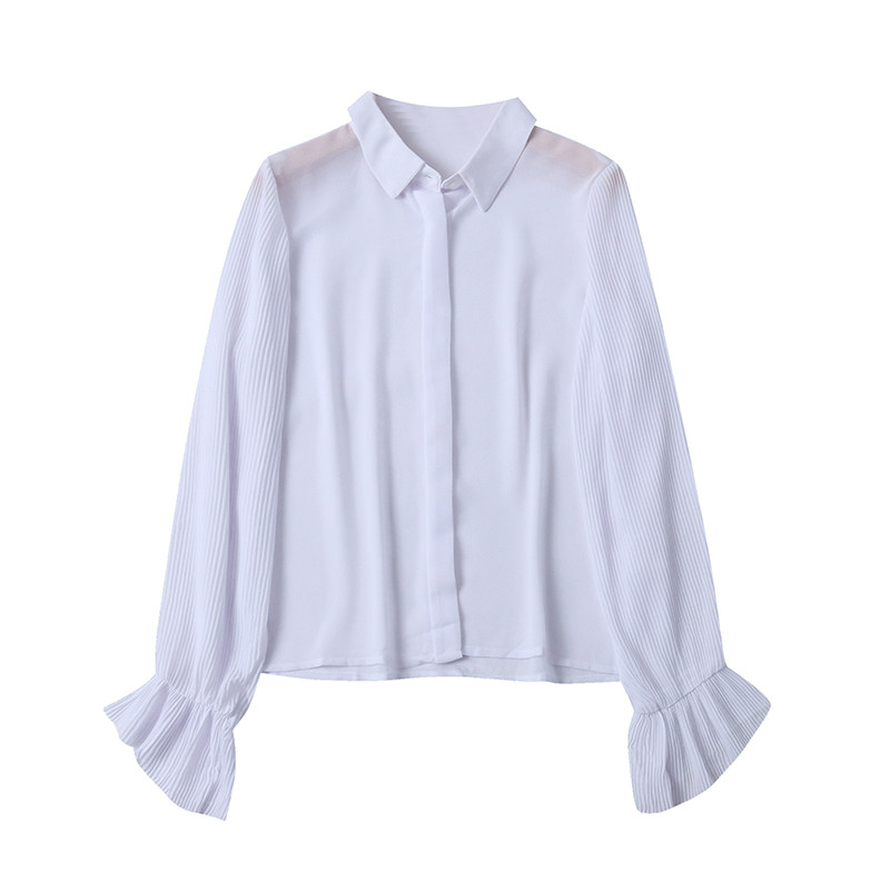 雪纺白衬衫春新款外贸女装时尚透视翻领单排扣百褶长袖上衣17598