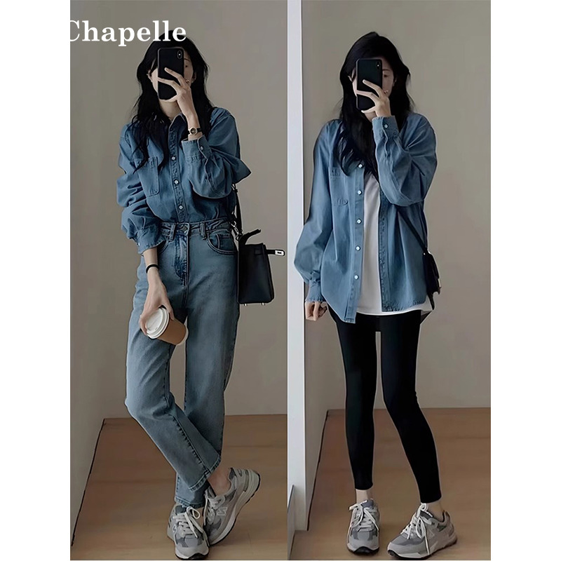 拉夏贝尔美式复古牛仔蓝衬衫外套秋季新款宽松气质减龄长袖上衣女