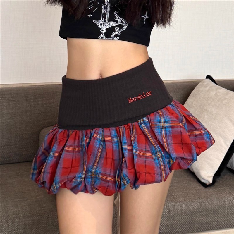 辣到中暑美式辣妹格纹拼接褶皱花苞超短裙针织高腰显瘦a字蓬蓬裙