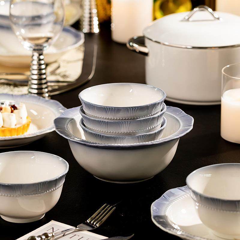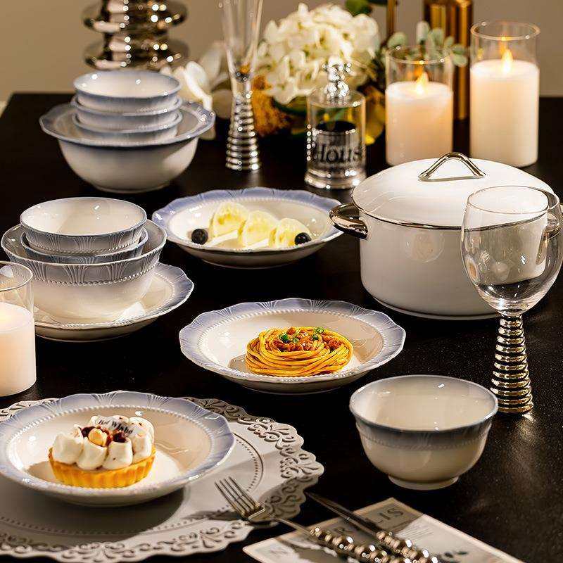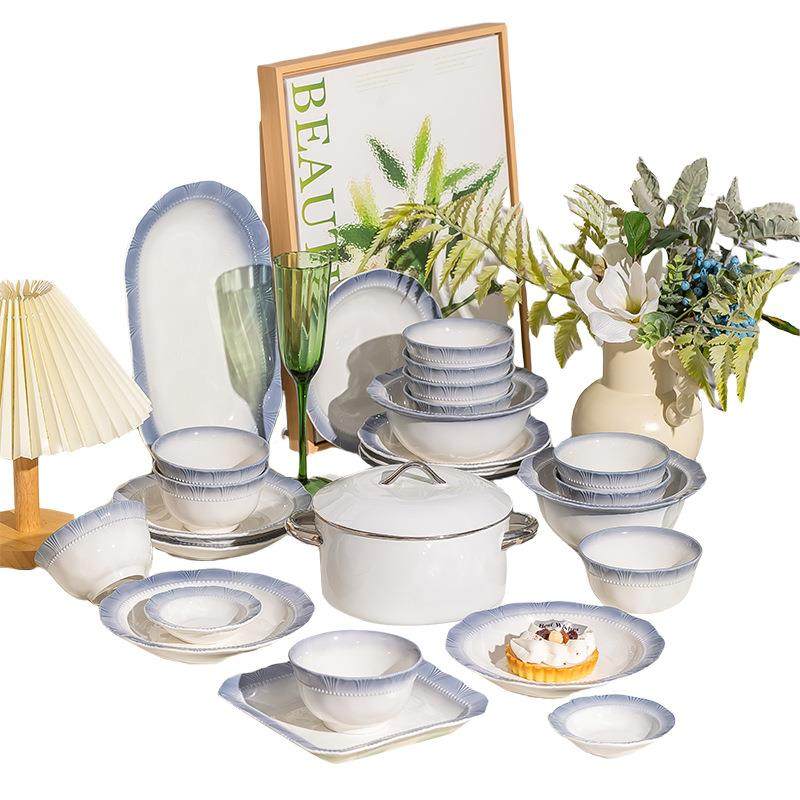 渐变烟蓝色碗碟套装家用高级感花边釉下彩陶瓷吃饭碗盘碟组合套装
