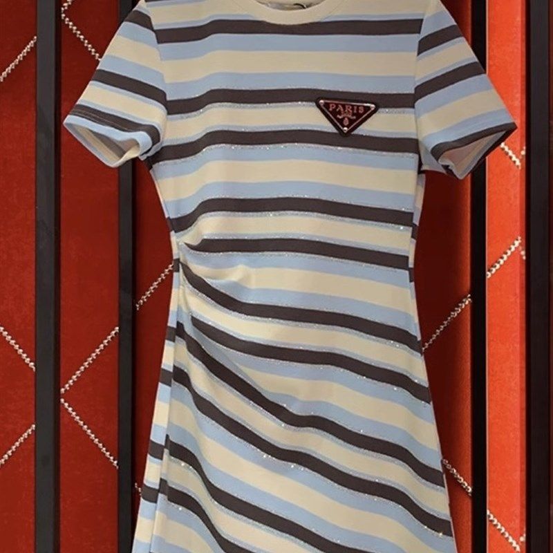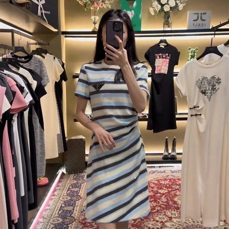 2023新款亲子装夏季一家三口婴儿条纹短袖t恤洋气时尚母女连衣裙