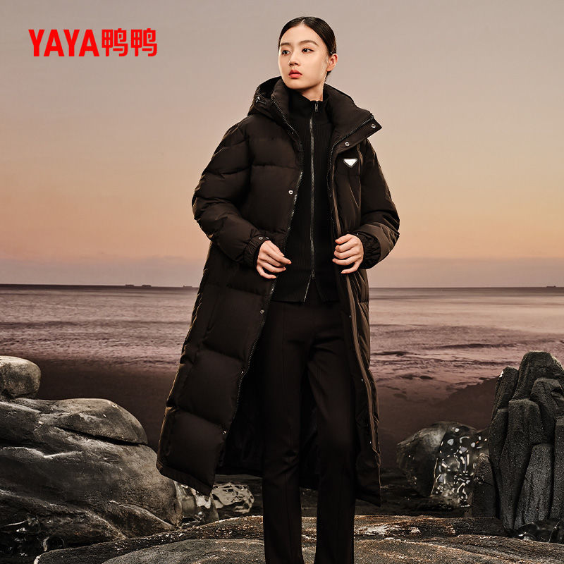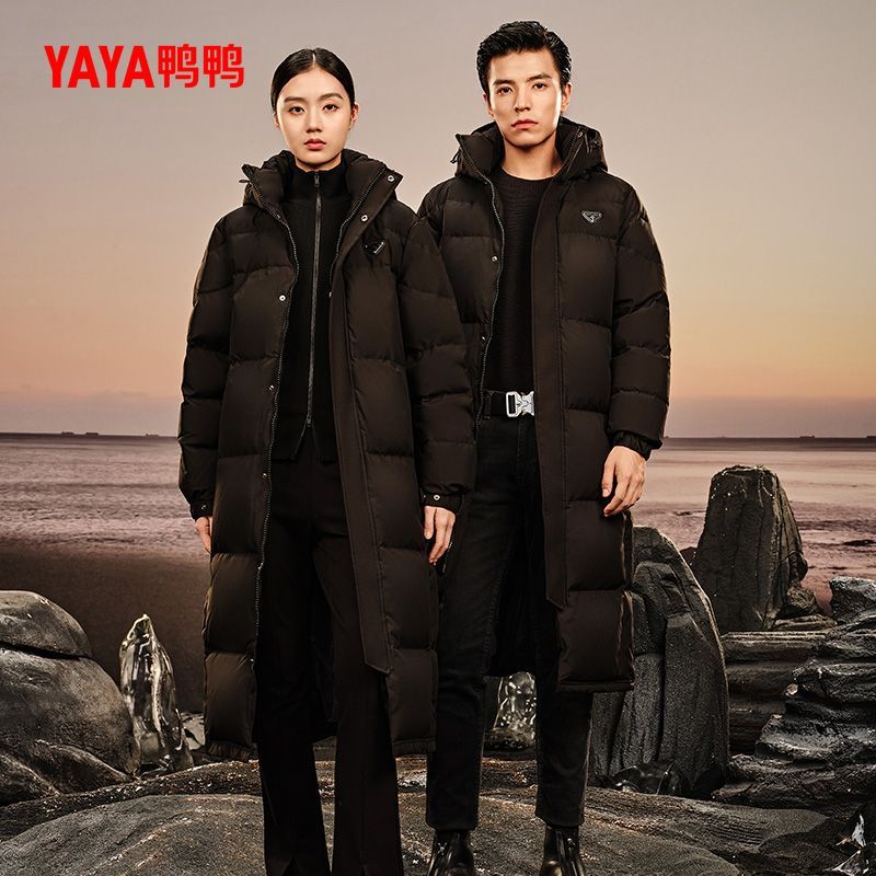 鸭鸭羽绒服女冬中戏pro情侣款长款羽绒服过膝加厚黑色连帽95鸭绒