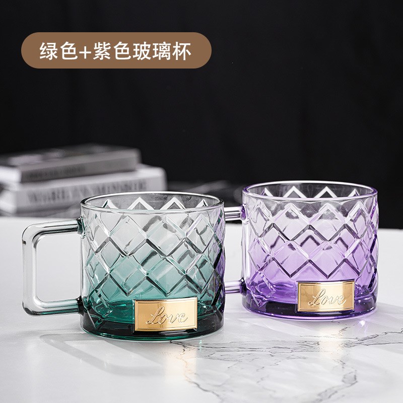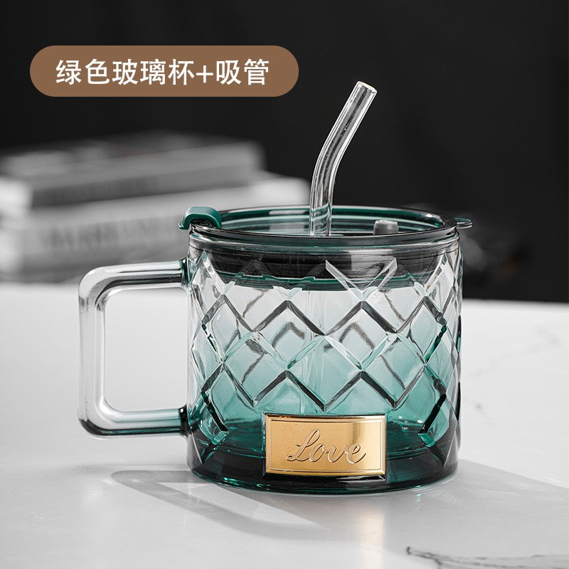 新款菱格杯加厚玻璃杯大容量玻璃水杯带盖带吸管高颜X值ins把杯