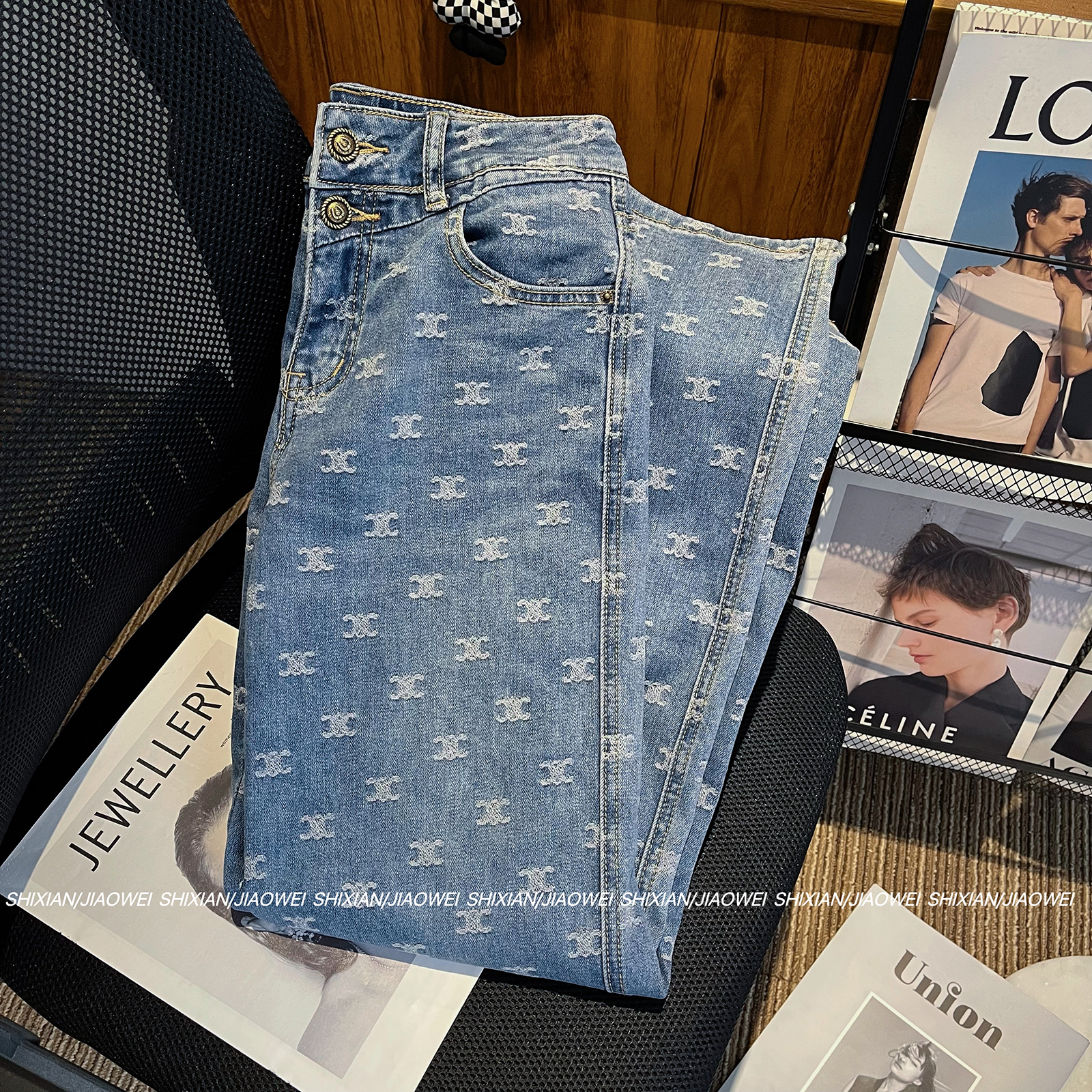 牛仔阔腿裤女春夏季2024年新款小个子洋气高腰宽松提花设计感直筒
