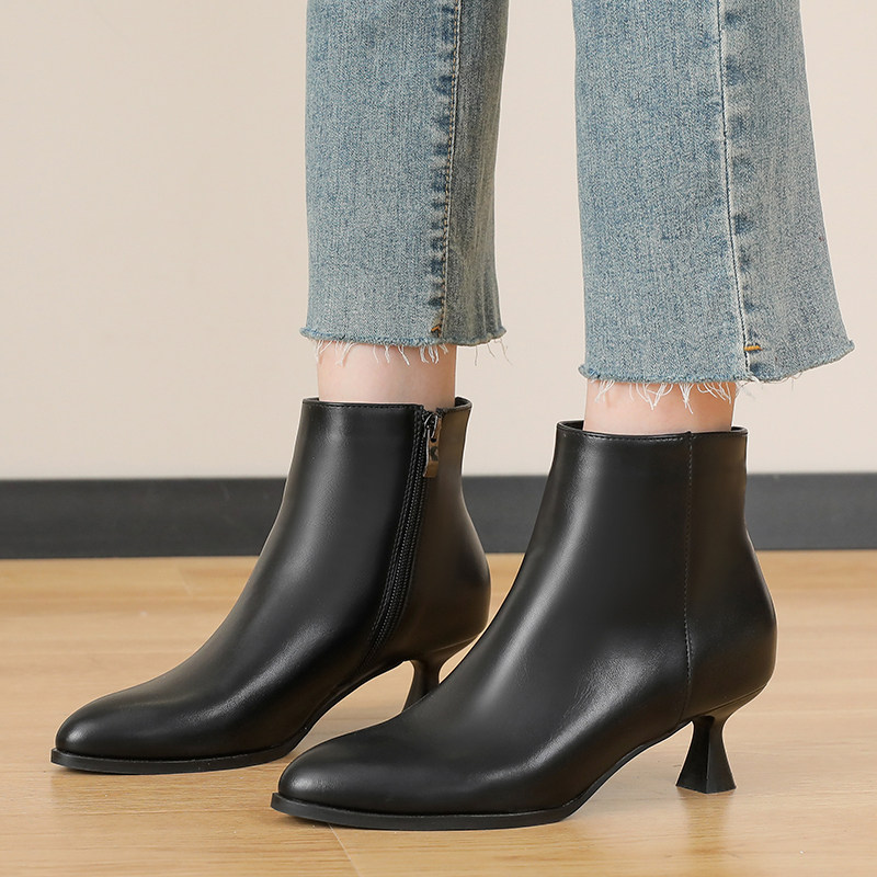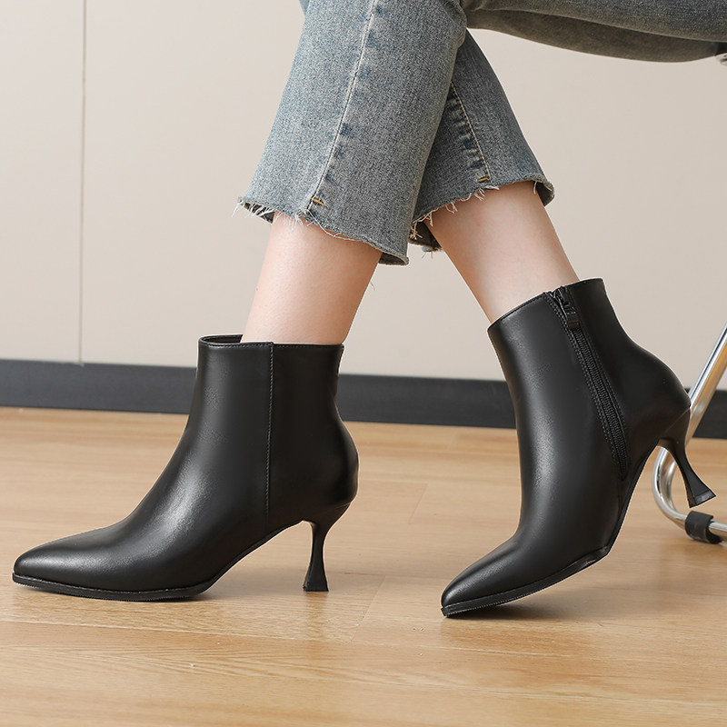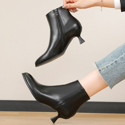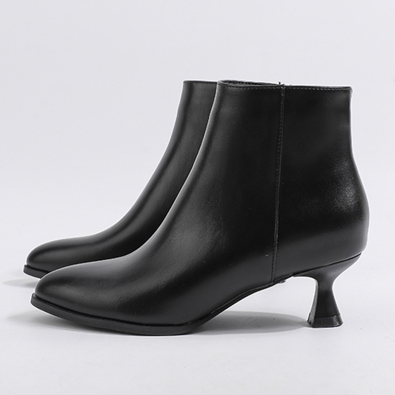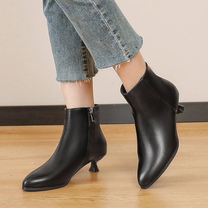 工装鞋女秋冬黑色加绒高跟鞋猫跟3厘米低跟女靴裸靴尖头细跟短靴