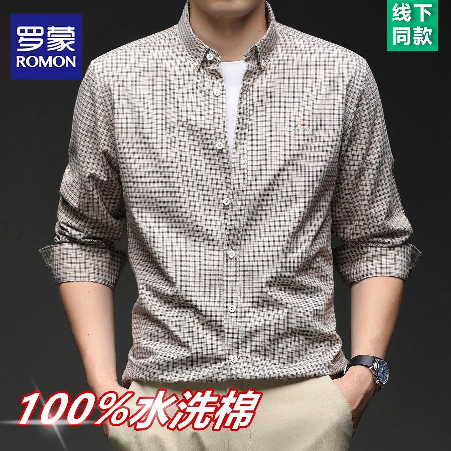 罗蒙2025秋季新款100%纯棉衬衫男士薄款商务休闲小格子长袖衬衣男