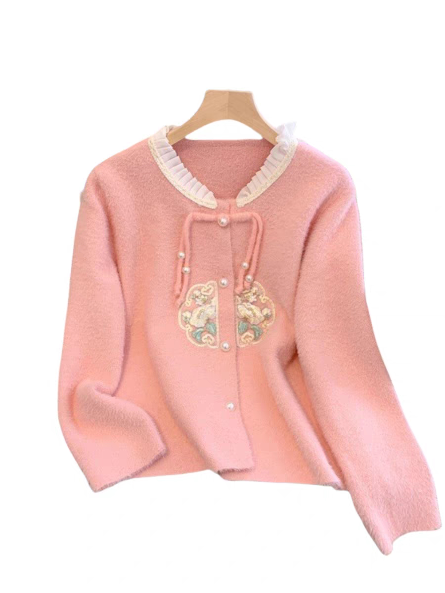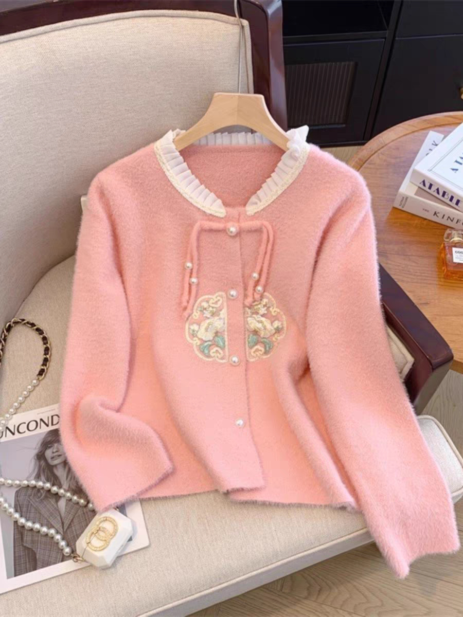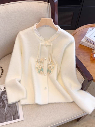 新中式国风盘扣刺绣针织毛衣女秋冬大码胖mm气质遮肚显瘦开衫上衣