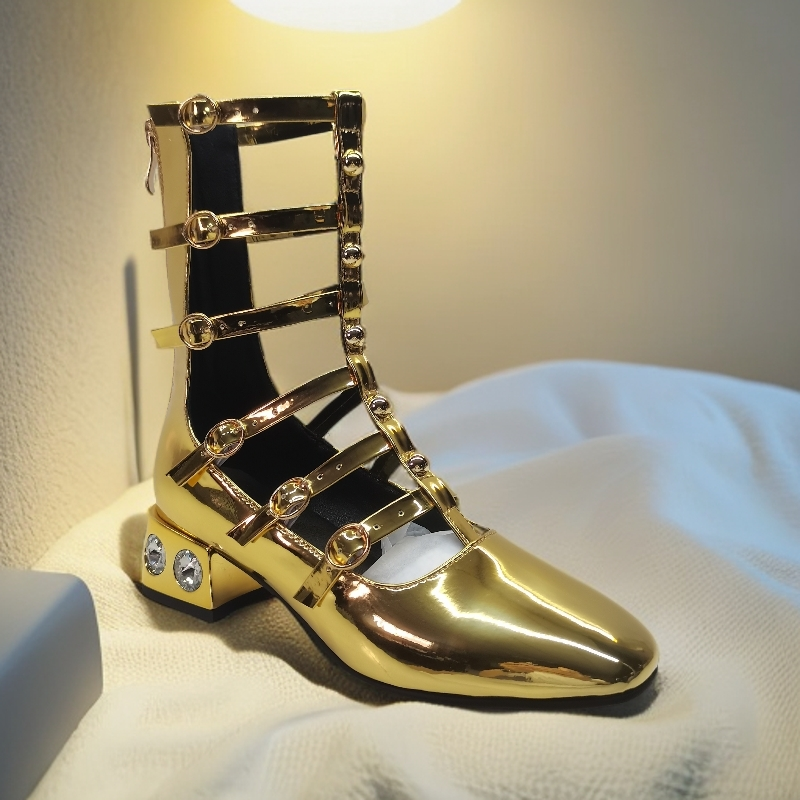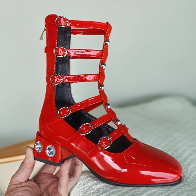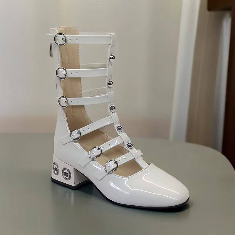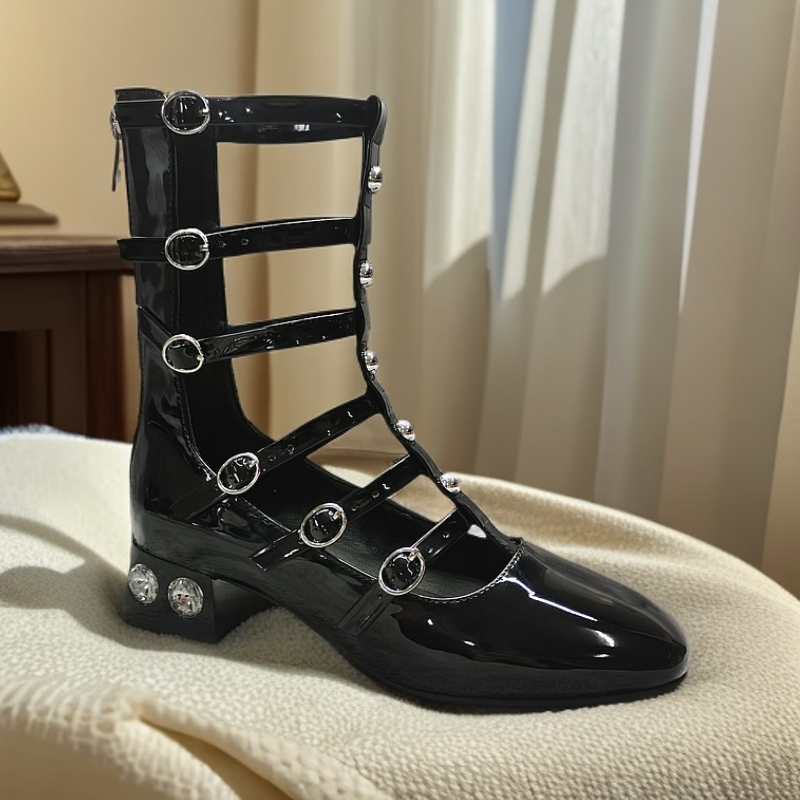 春夏水钻宝石粗跟亮漆皮镂空皮带扣中筒靴小码模特走秀比赛小黑靴