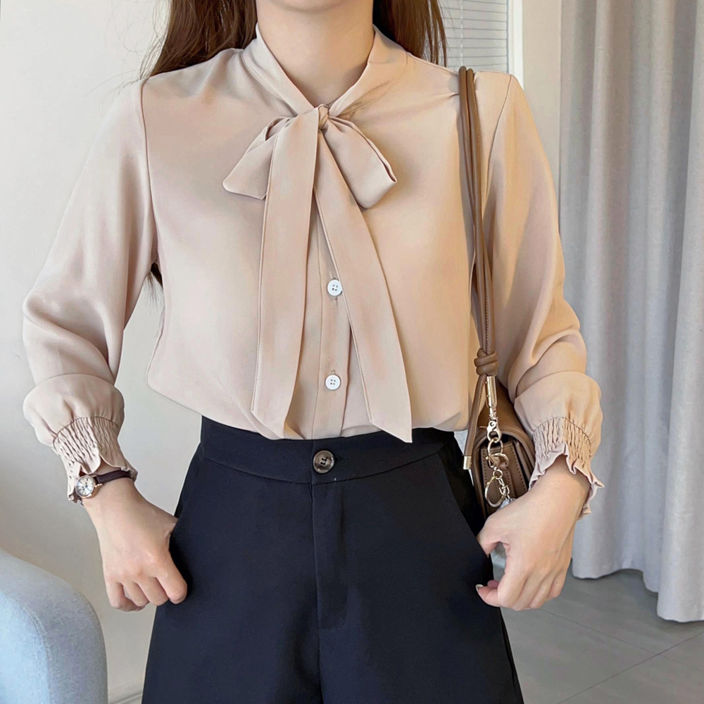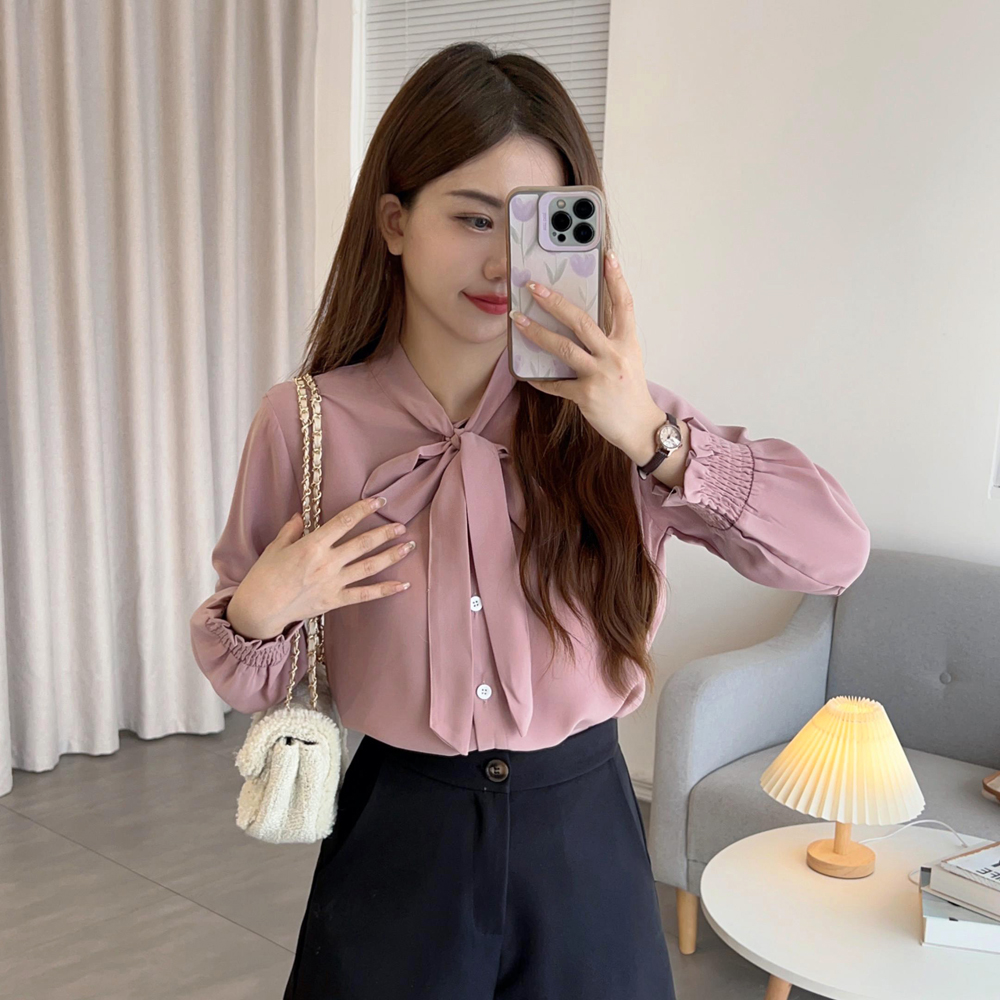 修身韩版单排扣蝴蝶结雪纺衬衫