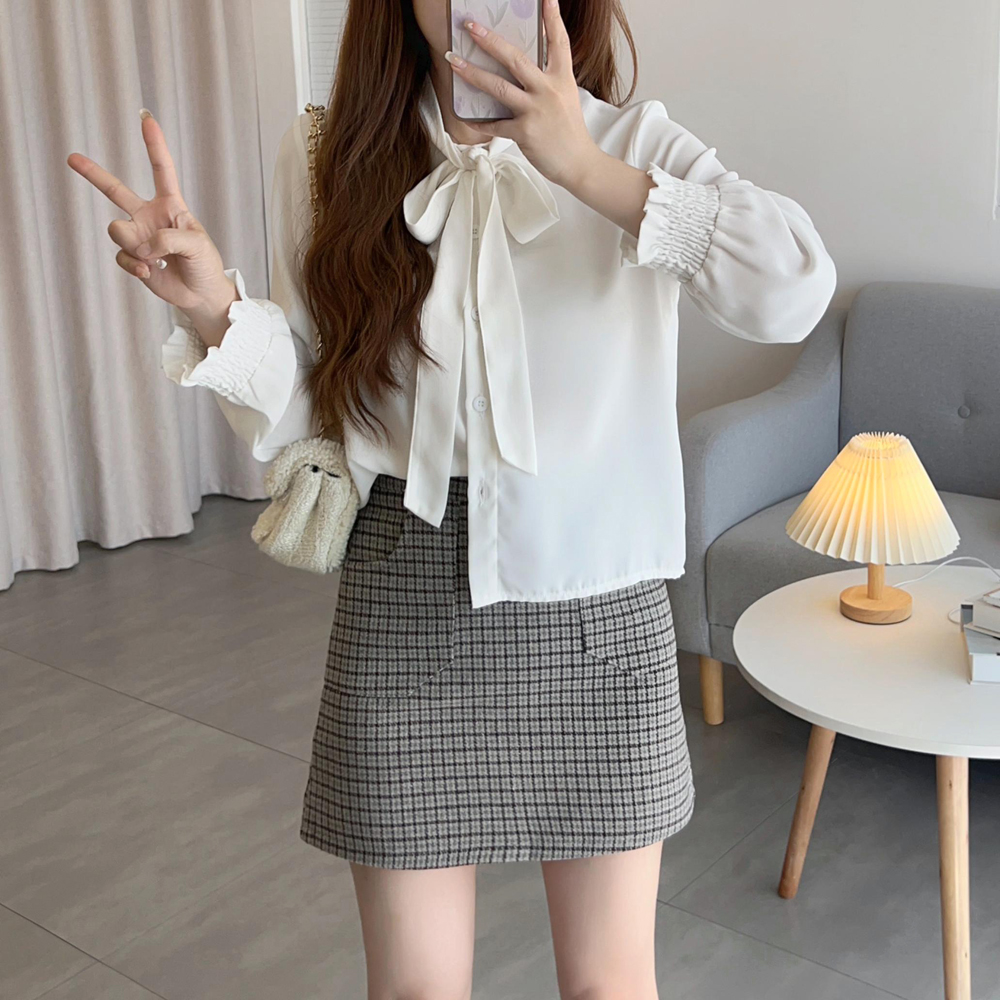 150小个子韩版修身气质优雅雪纺蝴蝶结系带9分袖衬衫上衣女装春秋