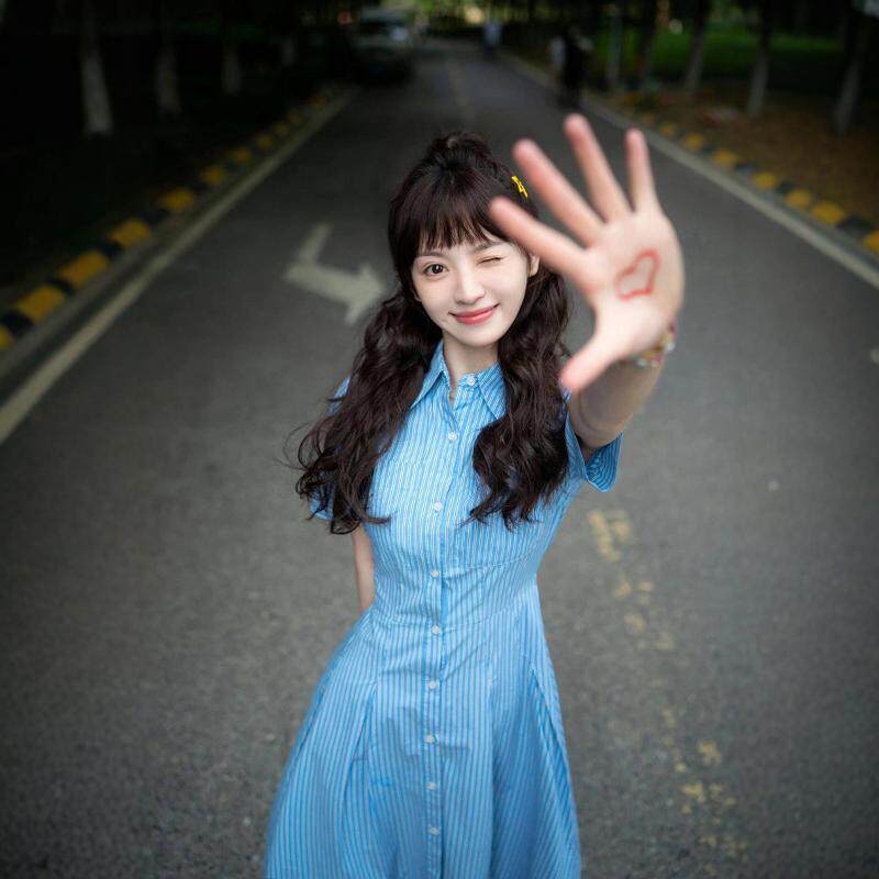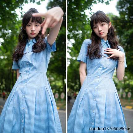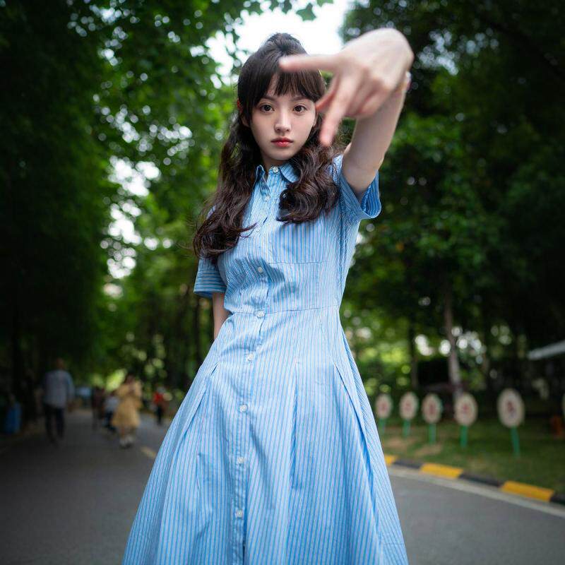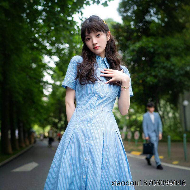 半熟男女田曦薇何知南同款蓝色条纹衬衫连衣裙A字收腰学院风短裙