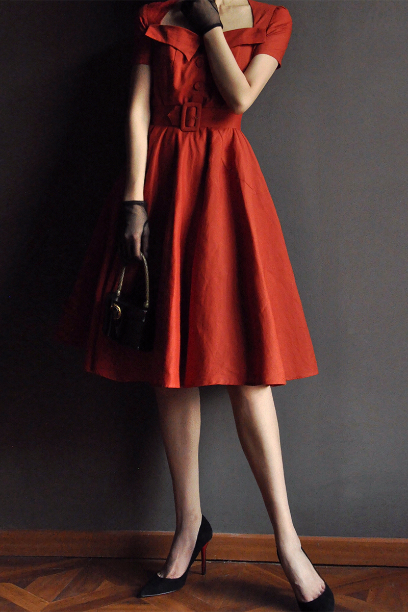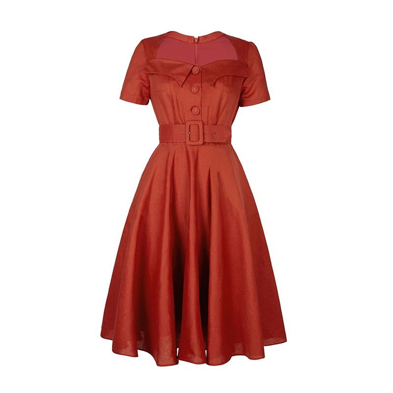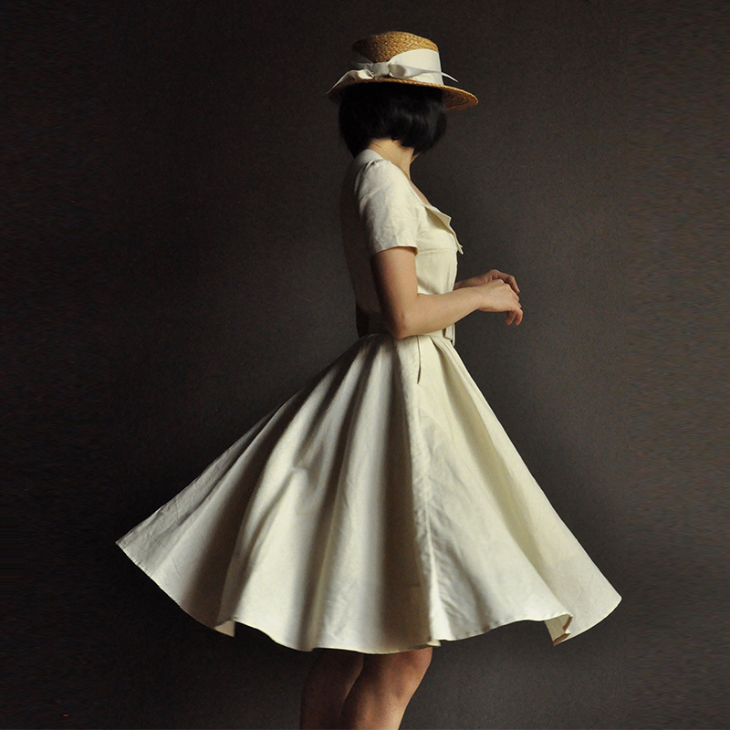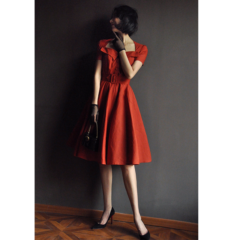 【断码清仓】Ching's 复古赫本方领收腰连衣裙 高腰气质修身棉麻