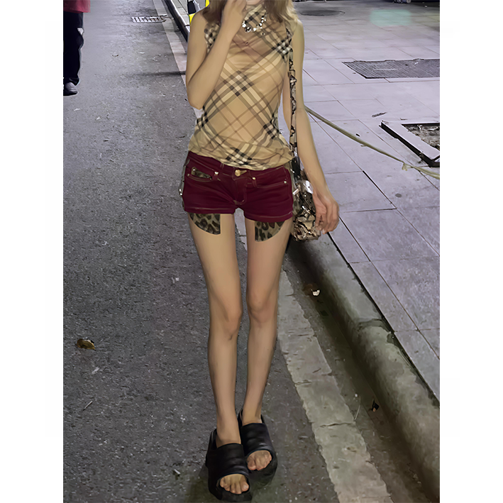 美式辣妹低腰牛仔短裤2025秋季新款修身显瘦豹纹拼接红色热短裤潮