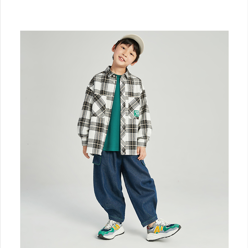 漫画家潮童装男童衬衫外套2023秋季新款磨毛格纹复古街头儿童上衣
