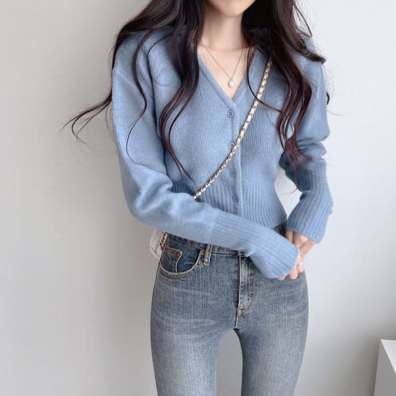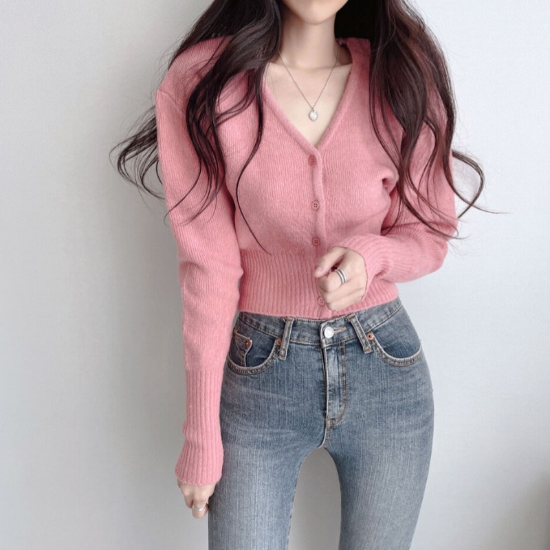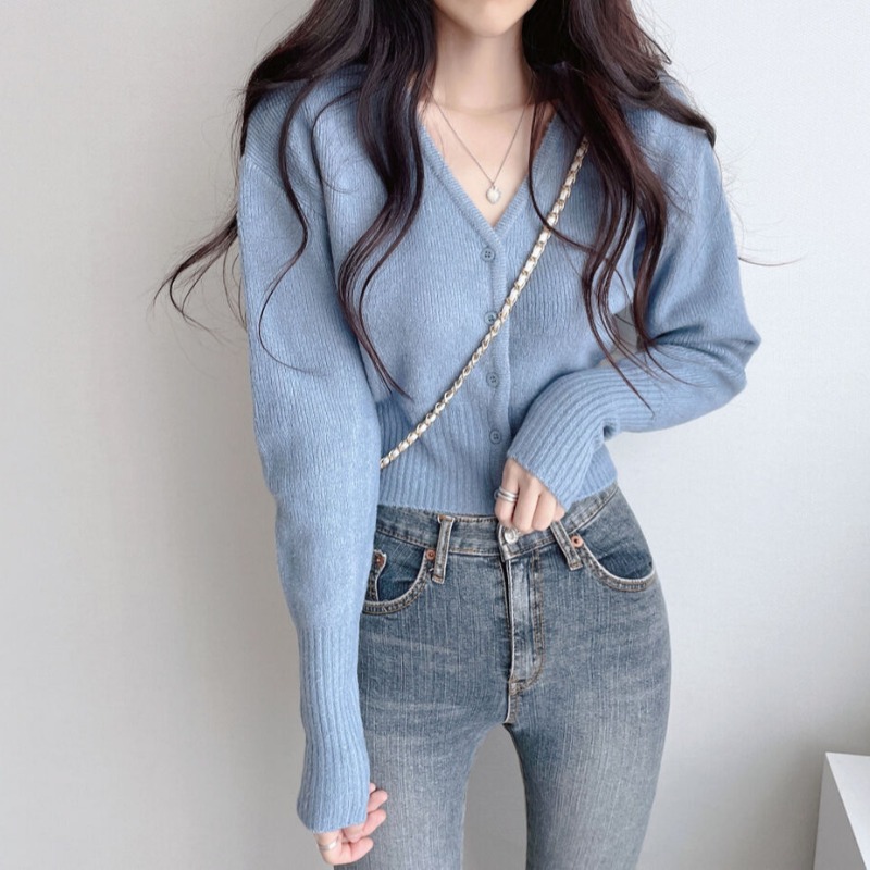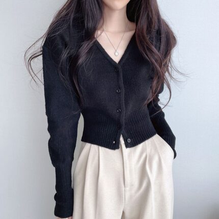 法式v领黑色针织开衫女冬季外穿收腰短款上衣显瘦氛围感毛衣外套