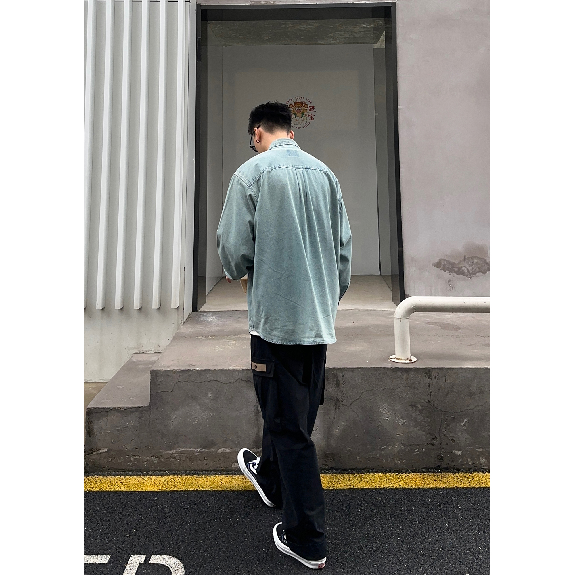 Batterup春秋新款外套日系宽松复古水洗做旧浅色牛仔长袖衬衫男潮