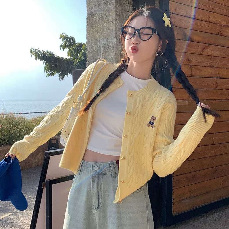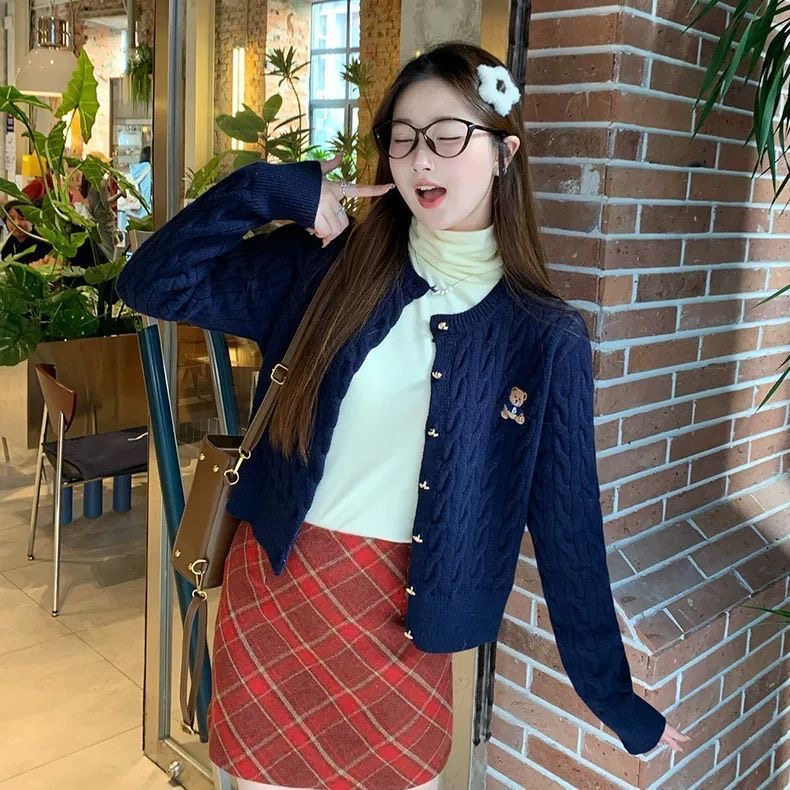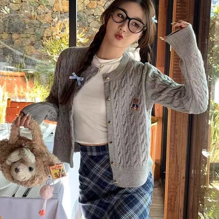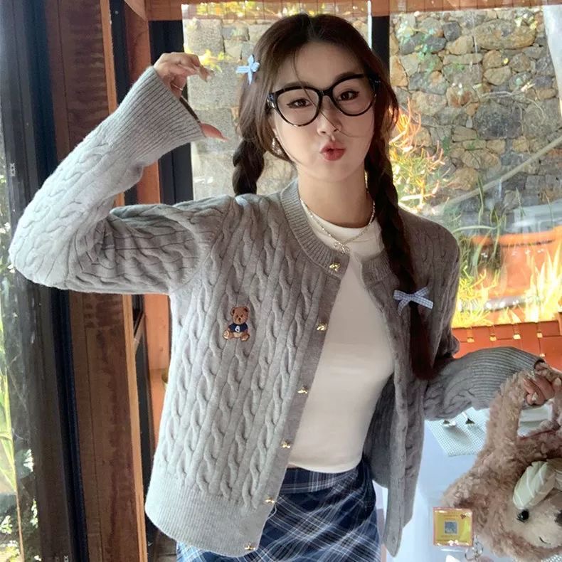 红色小熊刺绣麻花长袖圆领开衫针织外套女装2025新款毛衣开春上衣