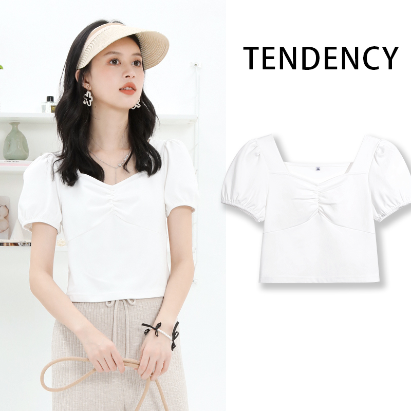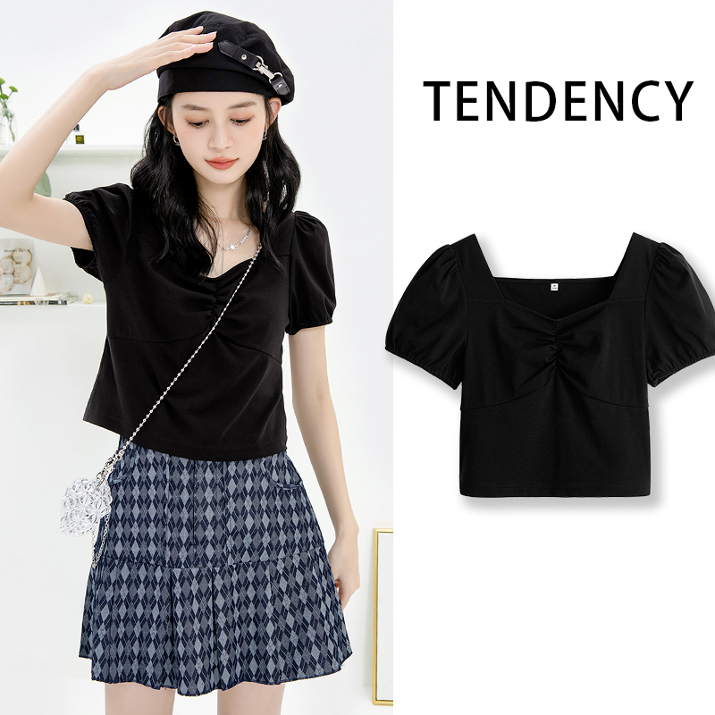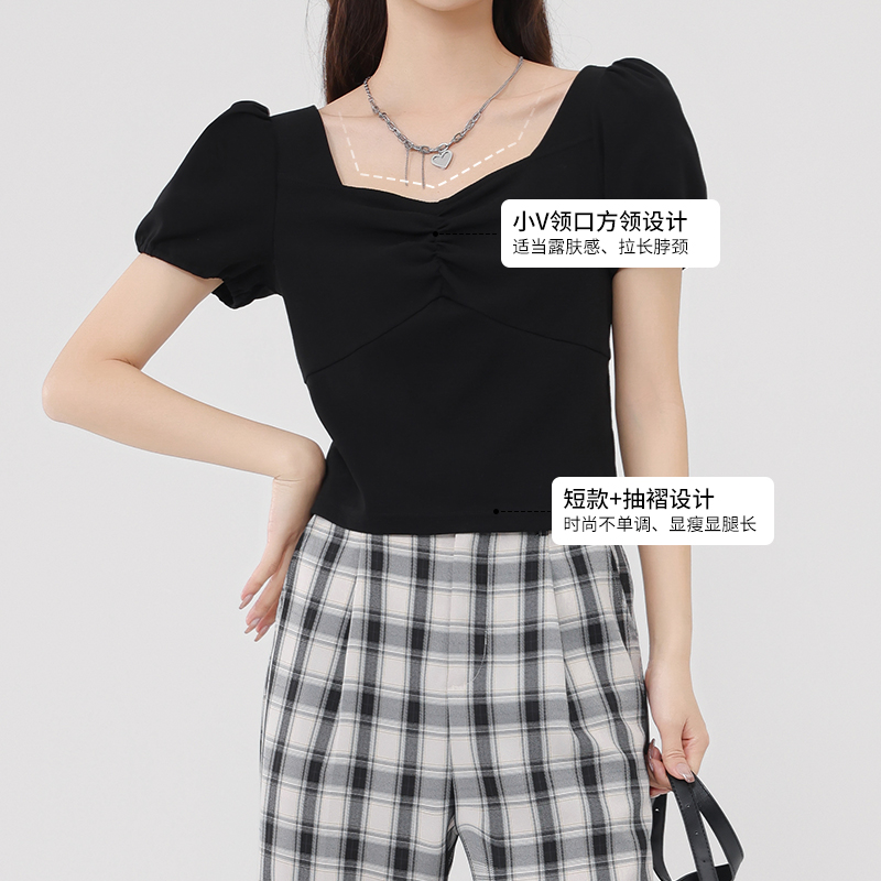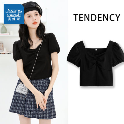 KMV真维斯短款短袖t恤女2025新款夏季方领纯欲风修身泡泡袖小上衣
