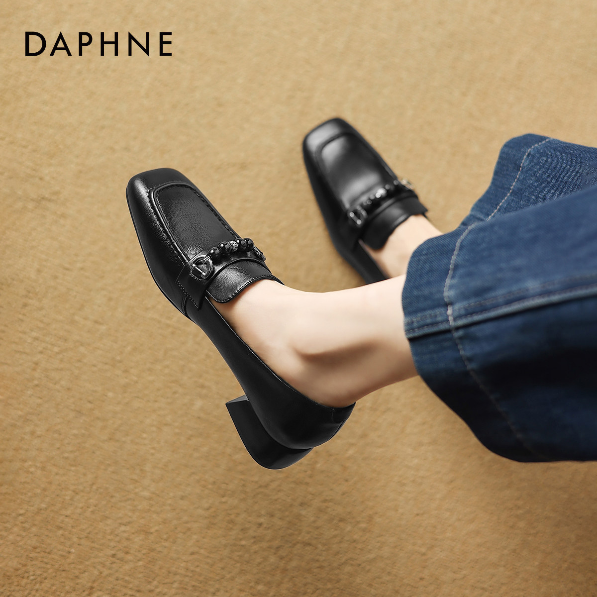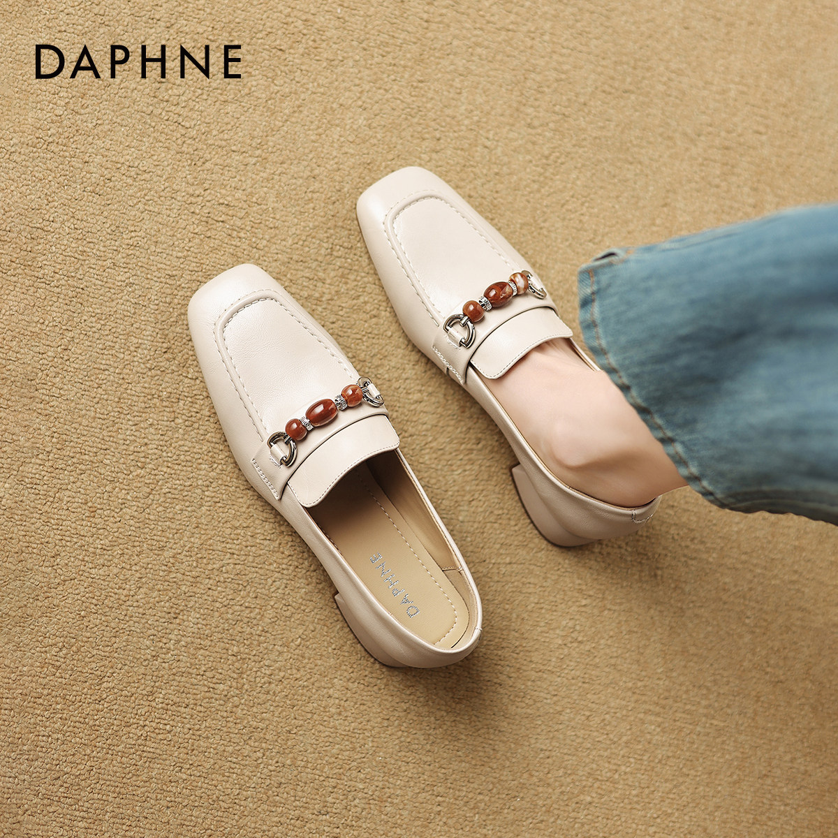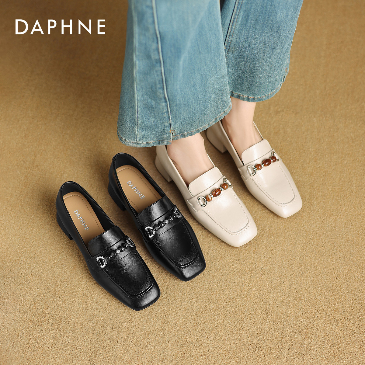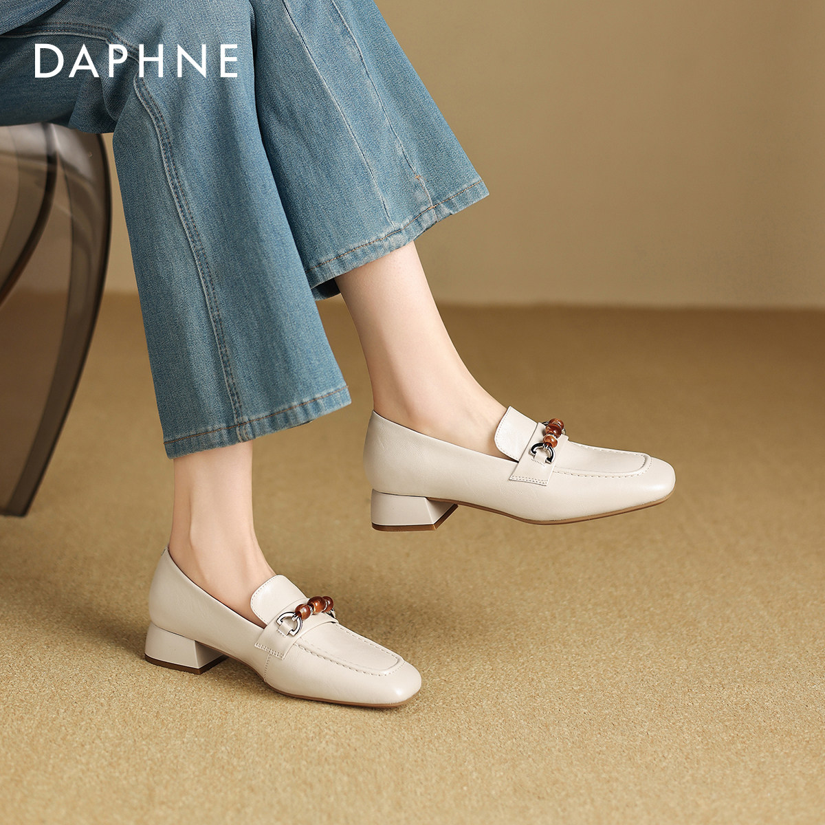 达芙妮白色乐福鞋女2026新款春季法式粗跟单鞋通勤女士高跟小皮鞋