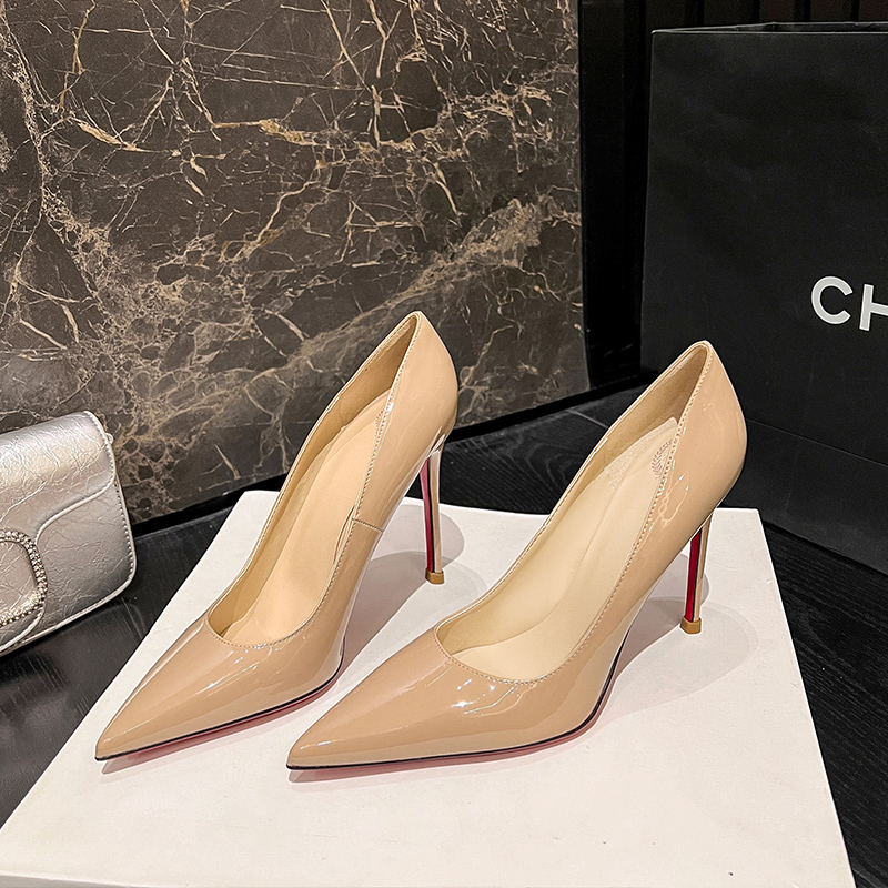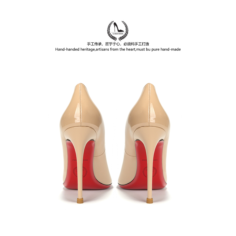 路客森尖头性感裸色高跟鞋女小个子气质CL红底细跟浅口舒适单鞋女