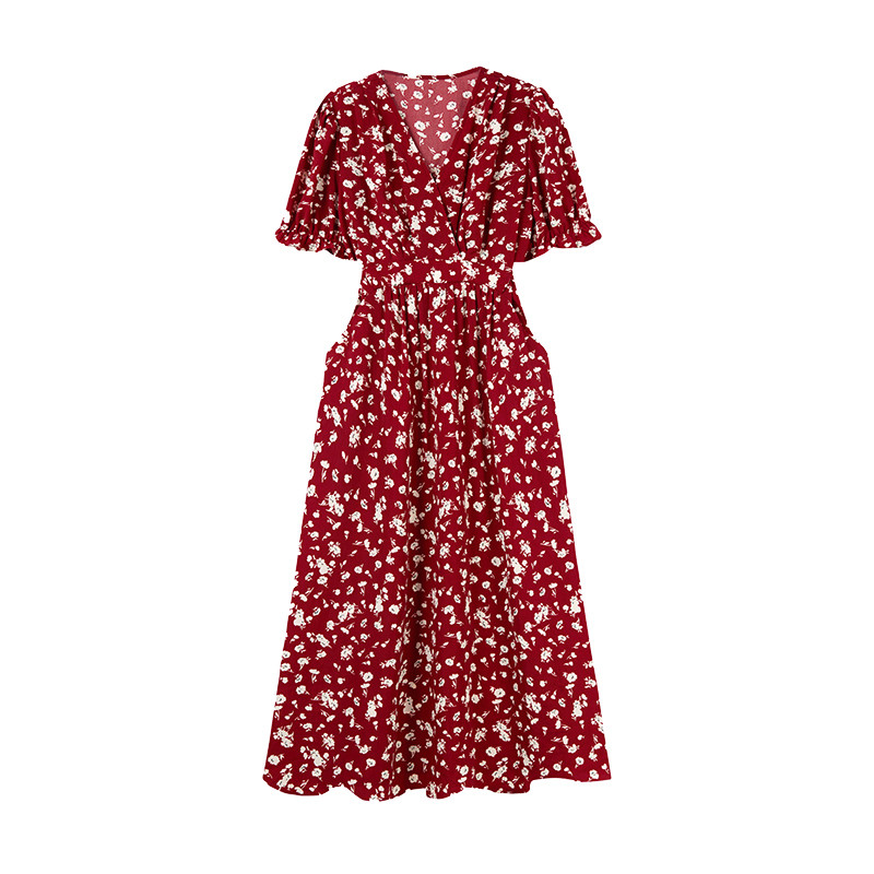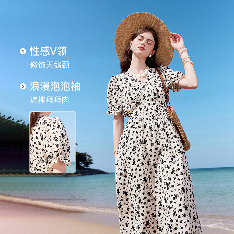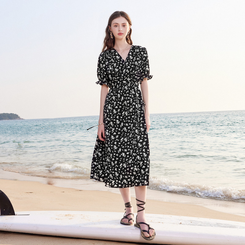 秋水伊人气质碎花黑色连衣裙2025新款女夏季修身显瘦收腰雪纺长裙