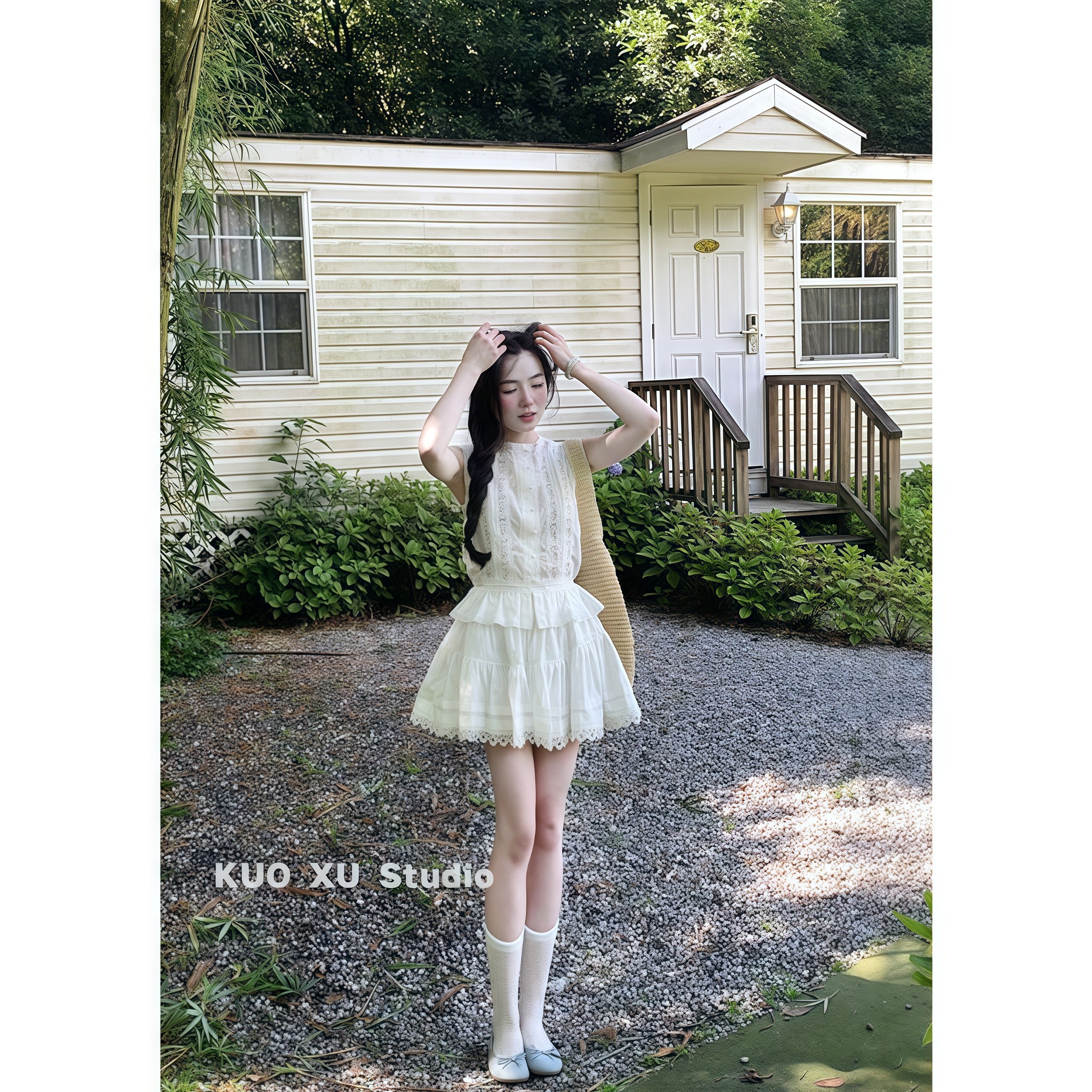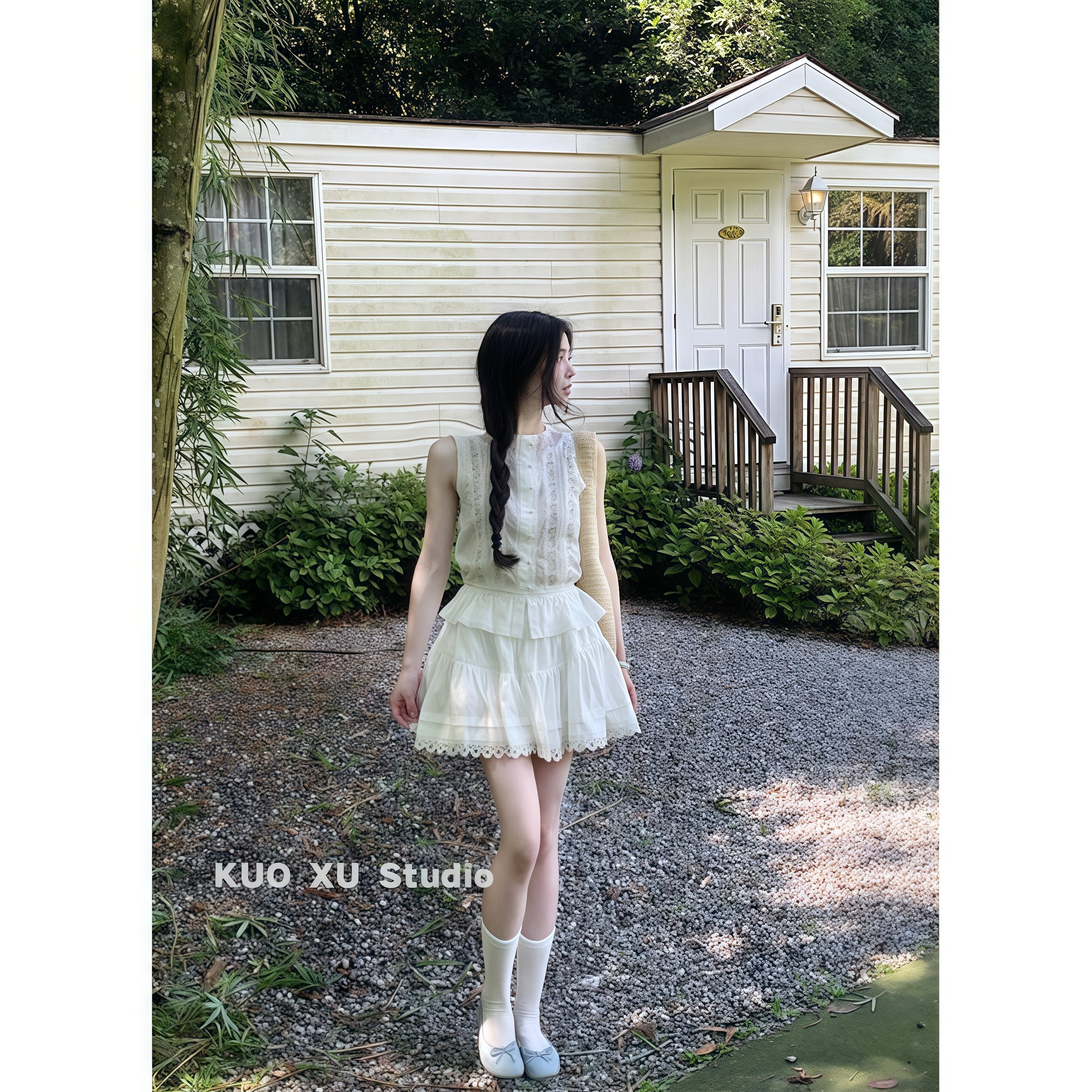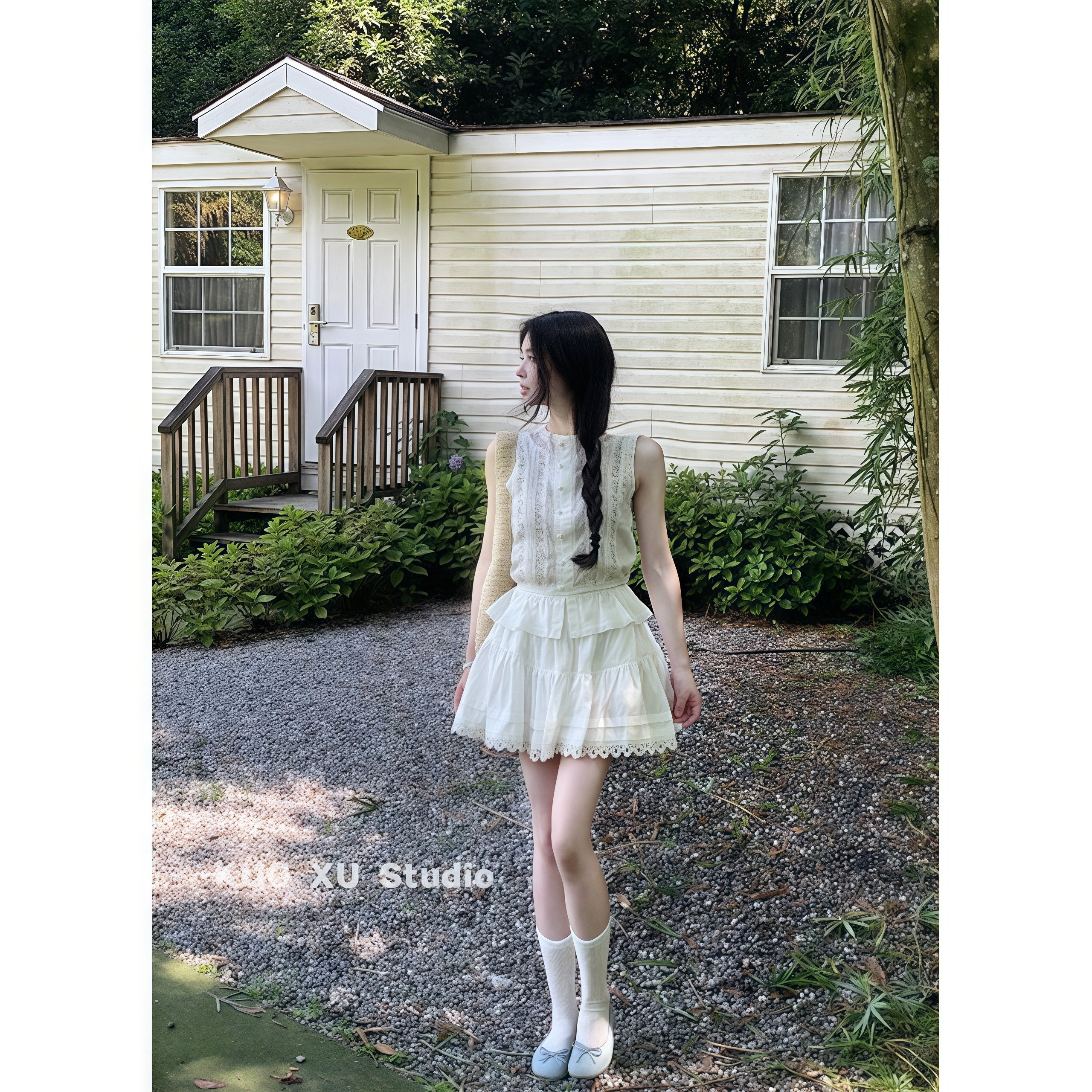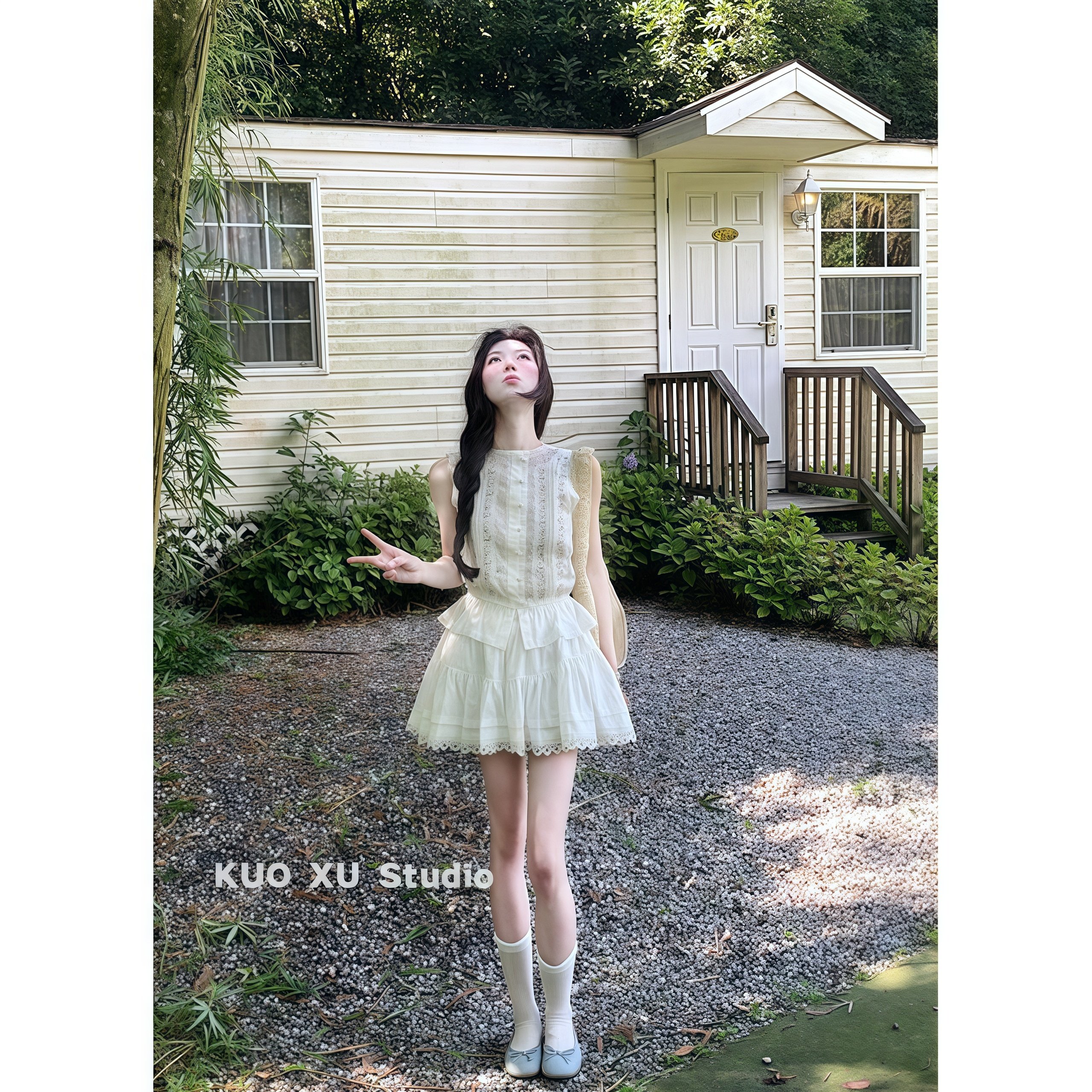巨好看的夏装一整套女蕾丝无袖上衣背心小衫a字蓬蓬裙蛋糕半身裙
