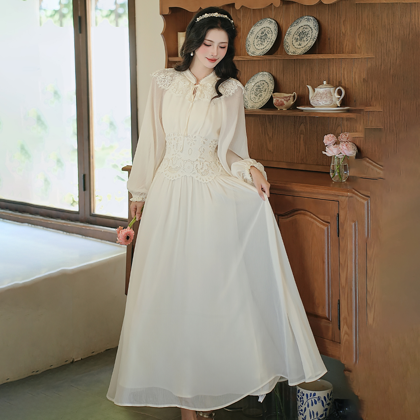 2025新款雪纺蕾丝拼接重工设计感时尚长袖连衣裙女高雅气质长裙子