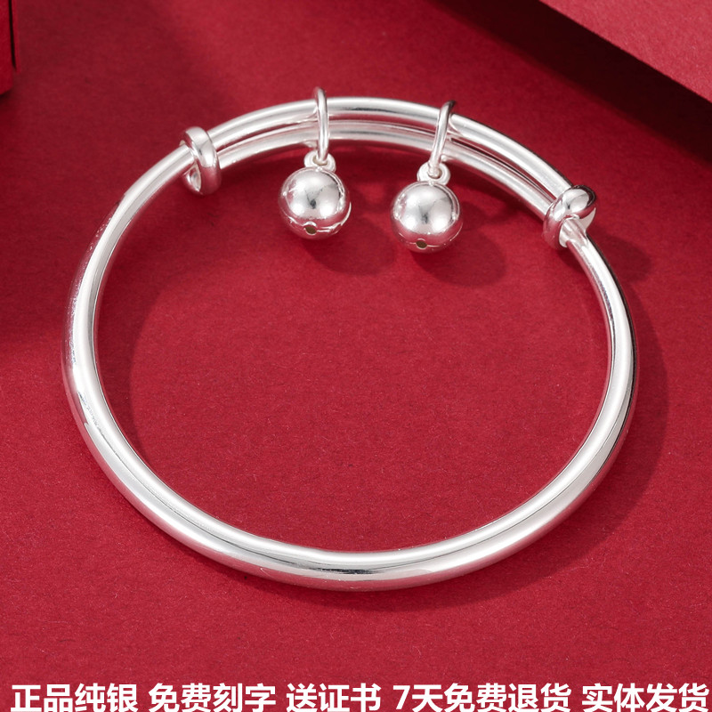 999纯银手镯女光面铃铛银饰实心足银镯子女生生日礼物送女朋友礼