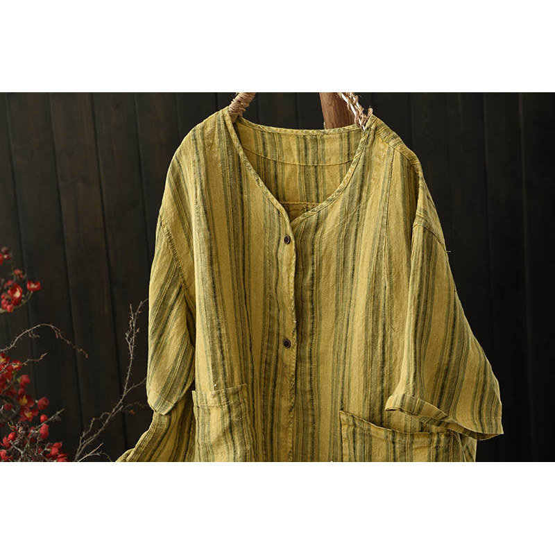默念文艺亚麻炒色条纹大码宽松系扣衬衫女夏季新款落肩短袖上衣