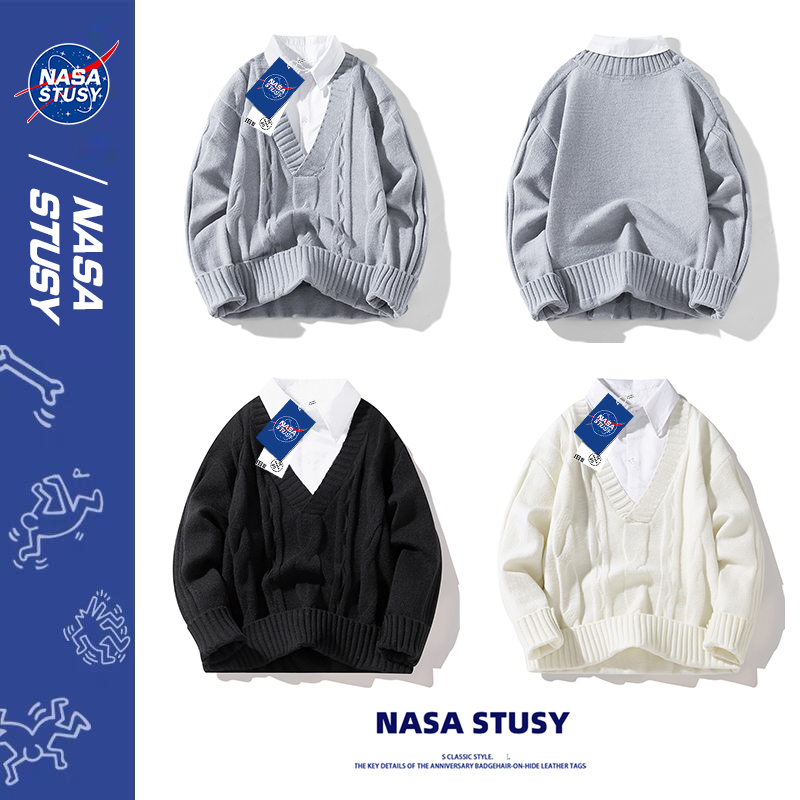 NASA STUSY美式2025新款秋冬装男款针织衫衬衫领假两件情侣毛衣
