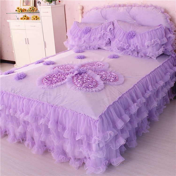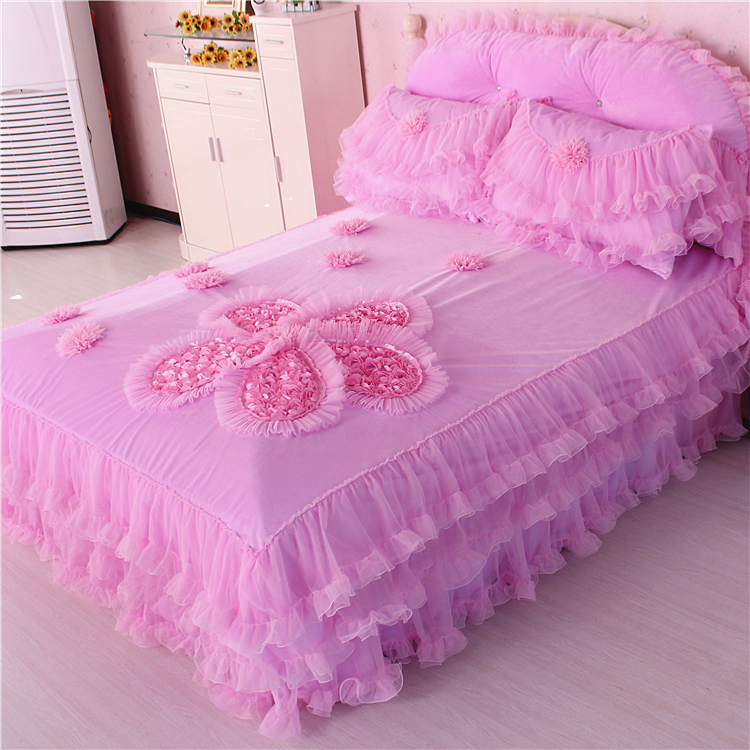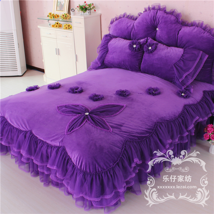 冬季珊瑚绒花边四件套蕾丝公主风田园床品加厚毛绒床裙被套家纺