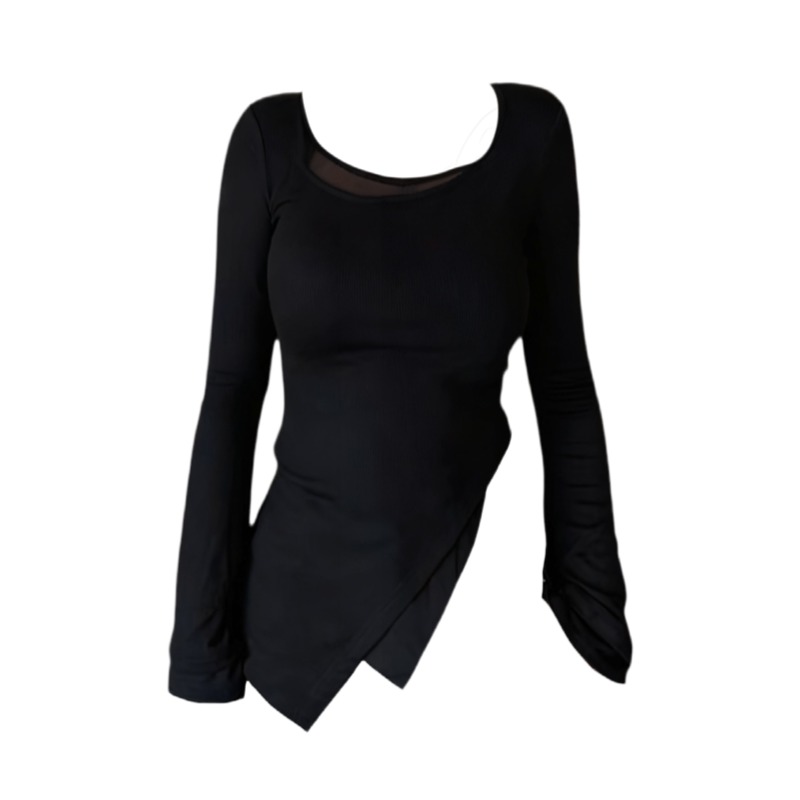 大码胖mm极简风方领长袖T恤女秋季新款黑色显瘦设计感打底衫上衣