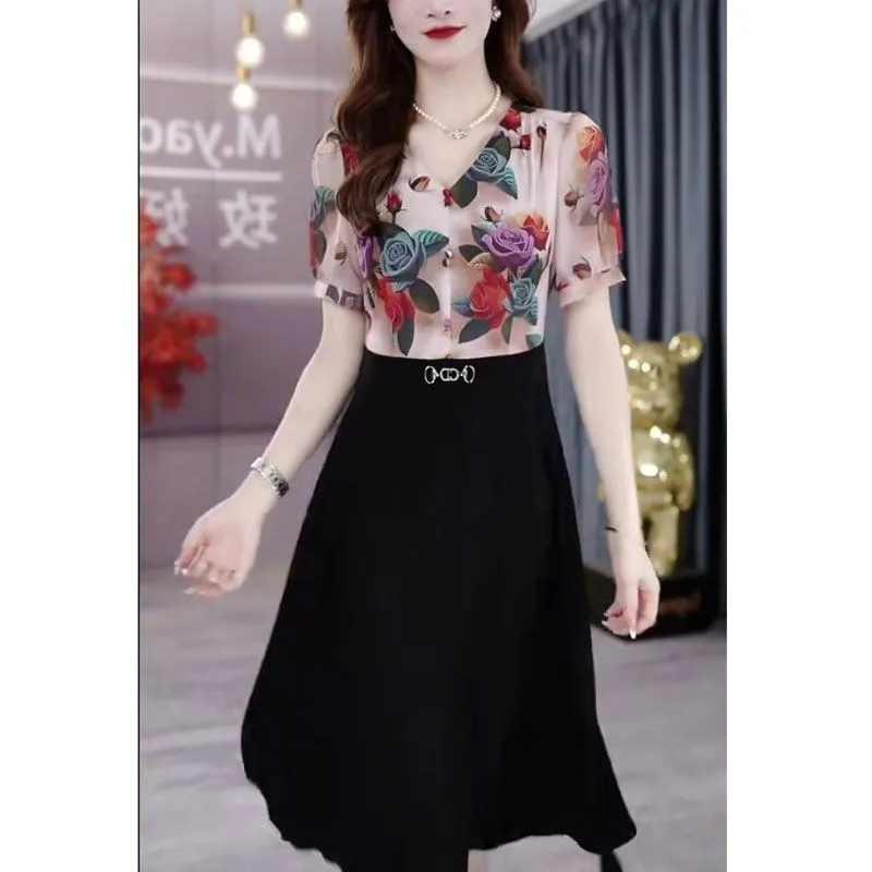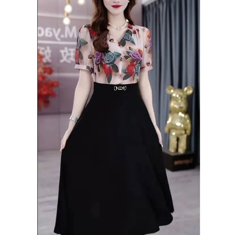 2025夏季新款气质收腰显瘦碎花长裙子女时尚假两件短袖百搭连衣裙