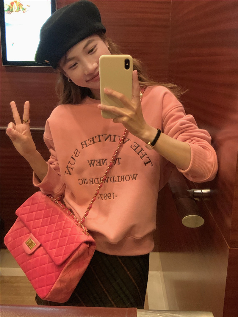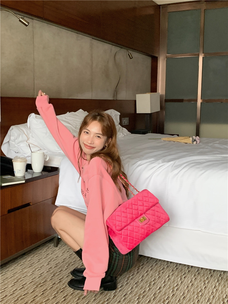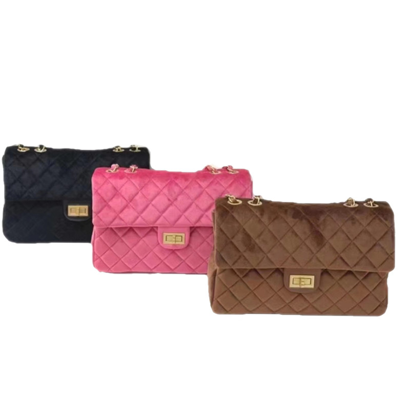 甜酷玫红色天鹅绒中古小香风拼接真皮大容量菱格链条包单肩斜挎包