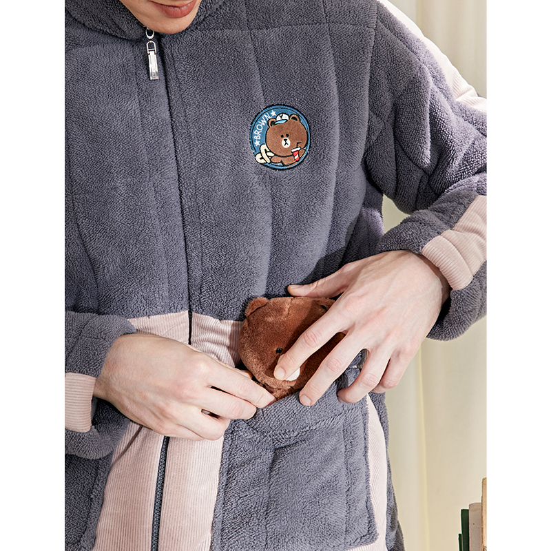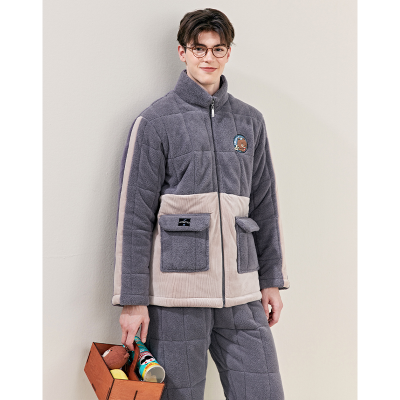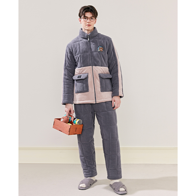 芬腾男士睡衣冬季珊瑚绒三层夹棉加厚套装布朗熊抗静电加绒家居服