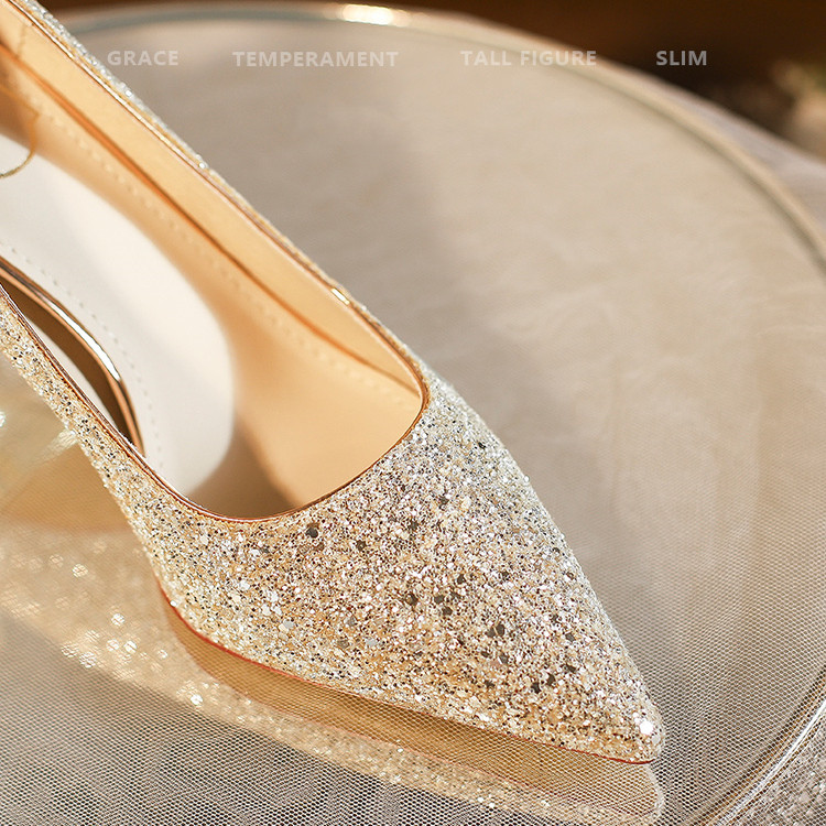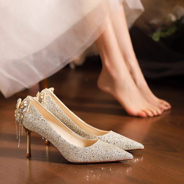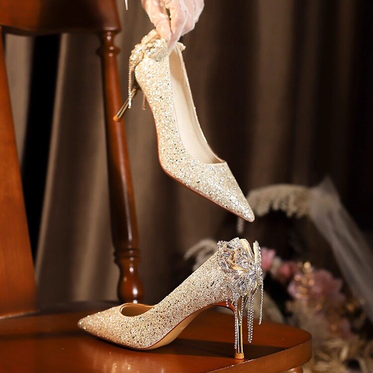 绝美婚鞋秀禾婚纱两穿尖头后蝴蝶结高跟鞋女细跟配婚纱日常