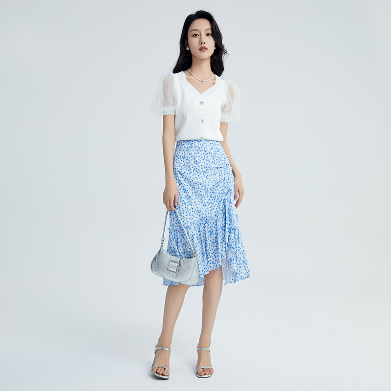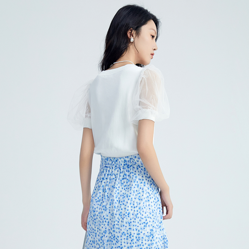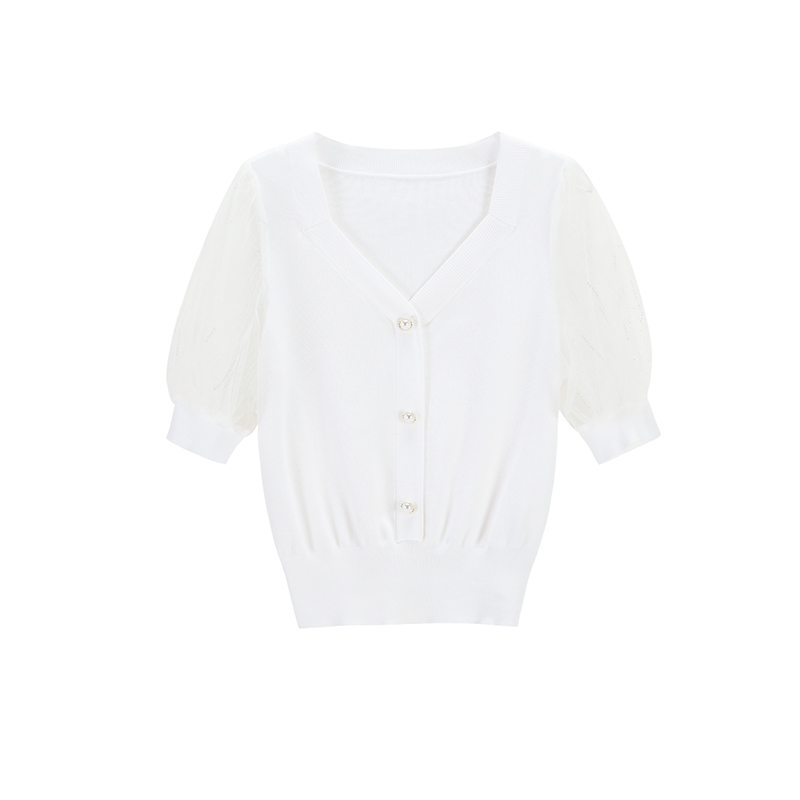 鲁思蒂白色短袖V领针织衫女2024新款夏季网纱泡泡袖薄款开衫上衣