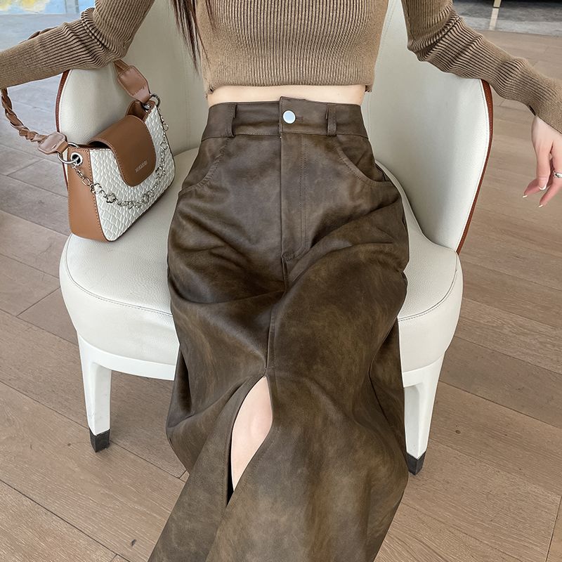 复古高腰皮裙女秋冬季pu皮高级感显瘦气质开叉中长款a字半身裙子