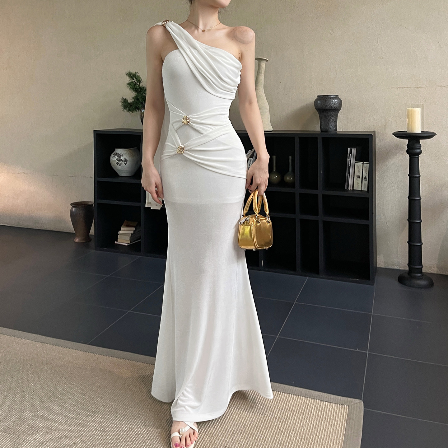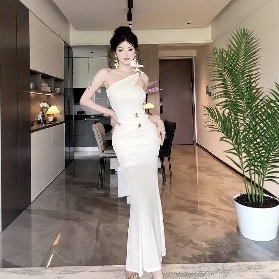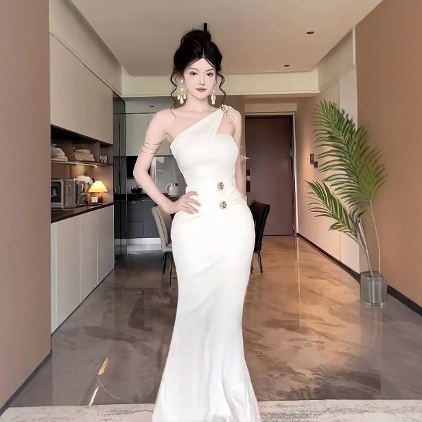 instunning法式白色露肩抹胸连衣裙女夏季新款修身鱼尾礼服长裙子