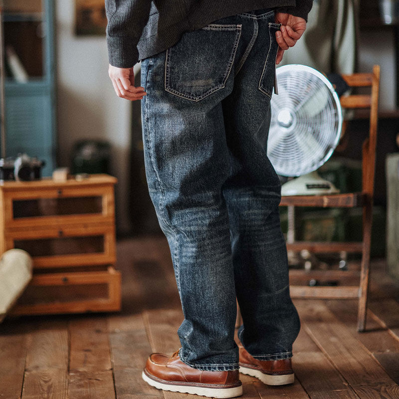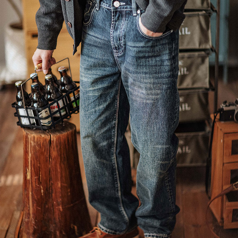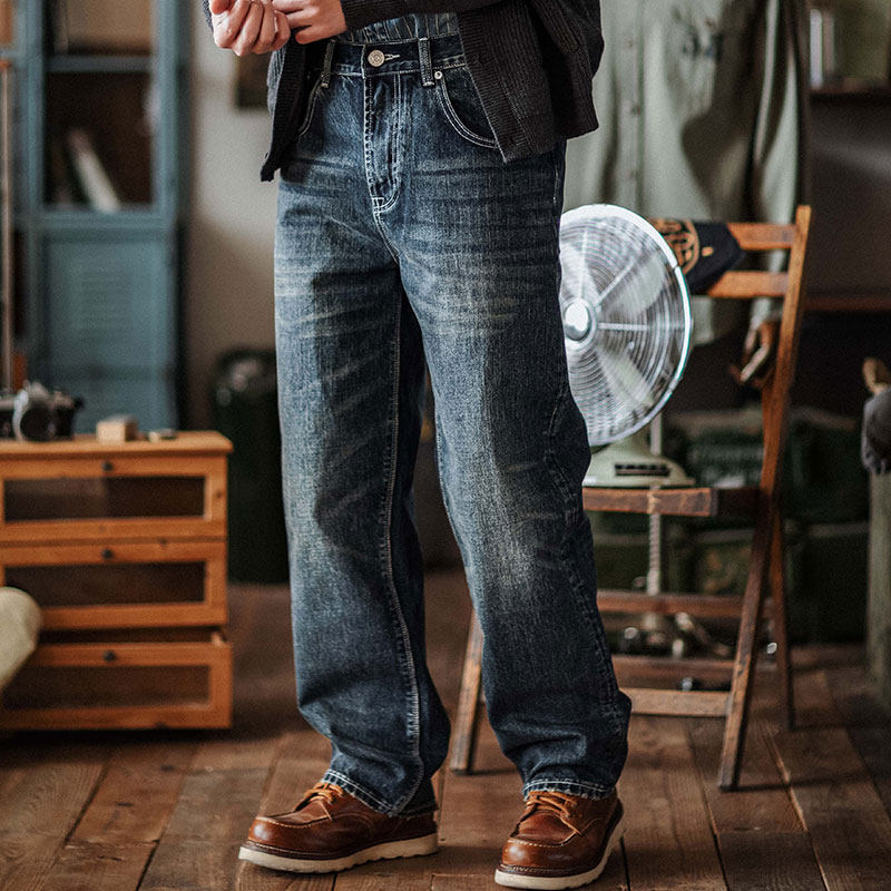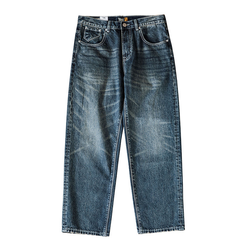 靛海美式重磅水洗磨破做旧直筒牛仔裤丹宁复古猫须宽松休闲长裤男