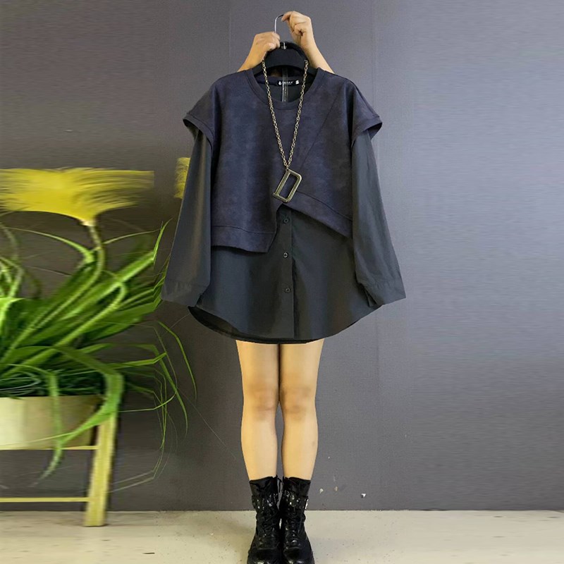 秋季新款2024时尚显瘦遮肚子假两件卫衣大码女装胖妹中长拼接衬衫
