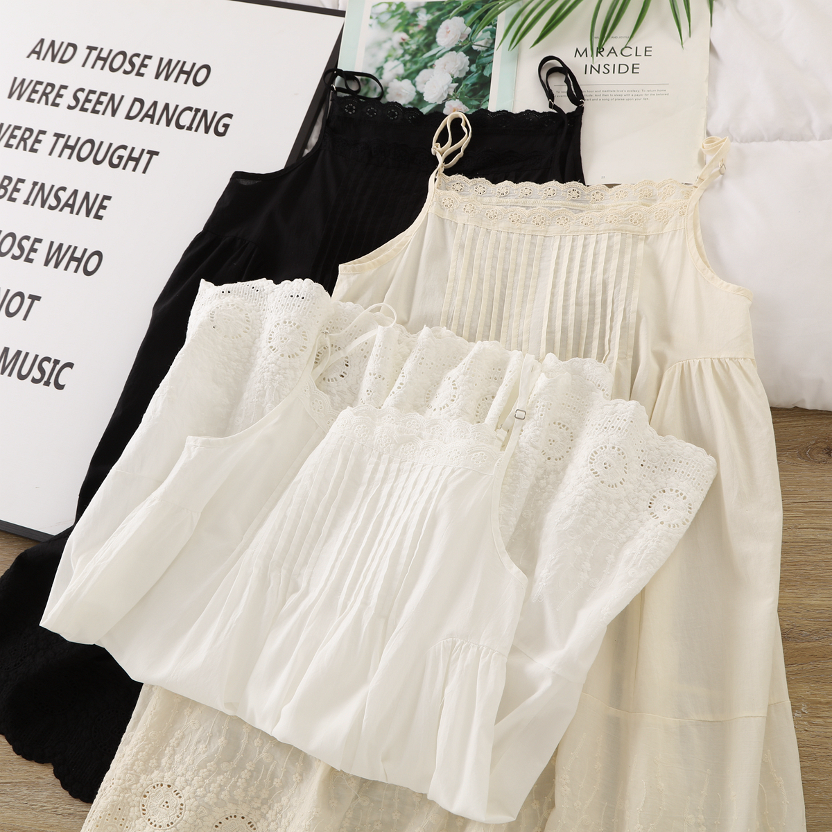 森系蕾丝花边刺绣文艺纯棉吊带连衣裙女宽松气质纯色百搭打底裙夏