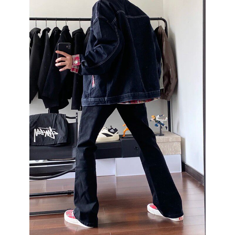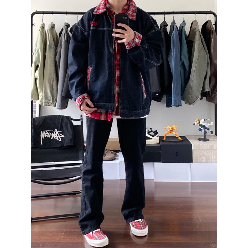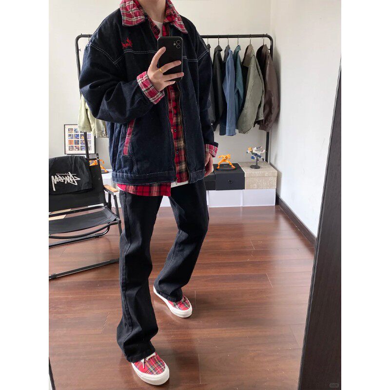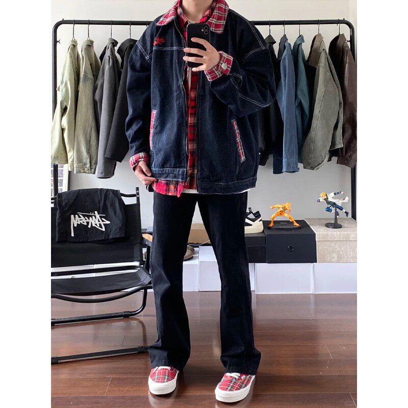 美式复古拼接格子牛仔外套男春秋高级感痞帅古着vintage工装夹克