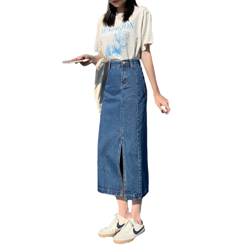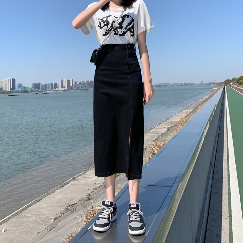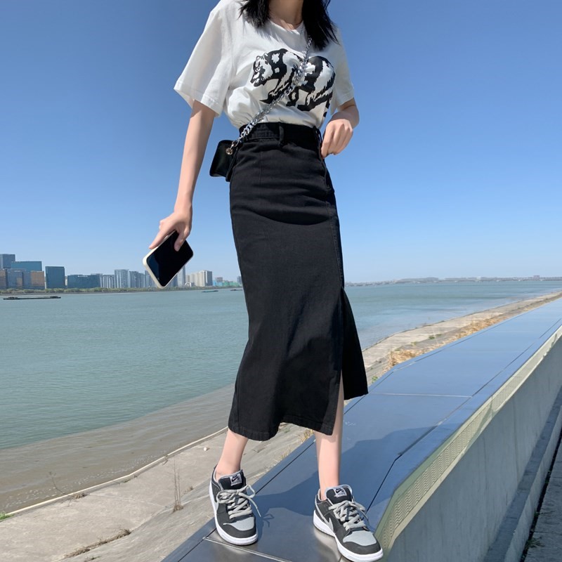 牛仔半身裙女2022春秋款高腰显瘦小个子中长款a字开叉包臀牛仔裙