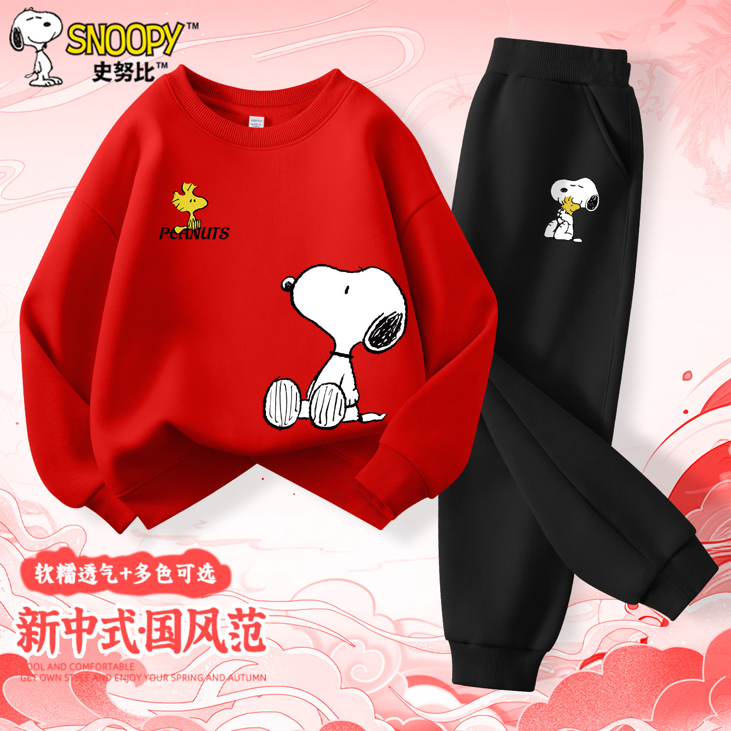 史努比儿童套装2025新款男孩运动服小学生红色卫衣春秋款男童秋装