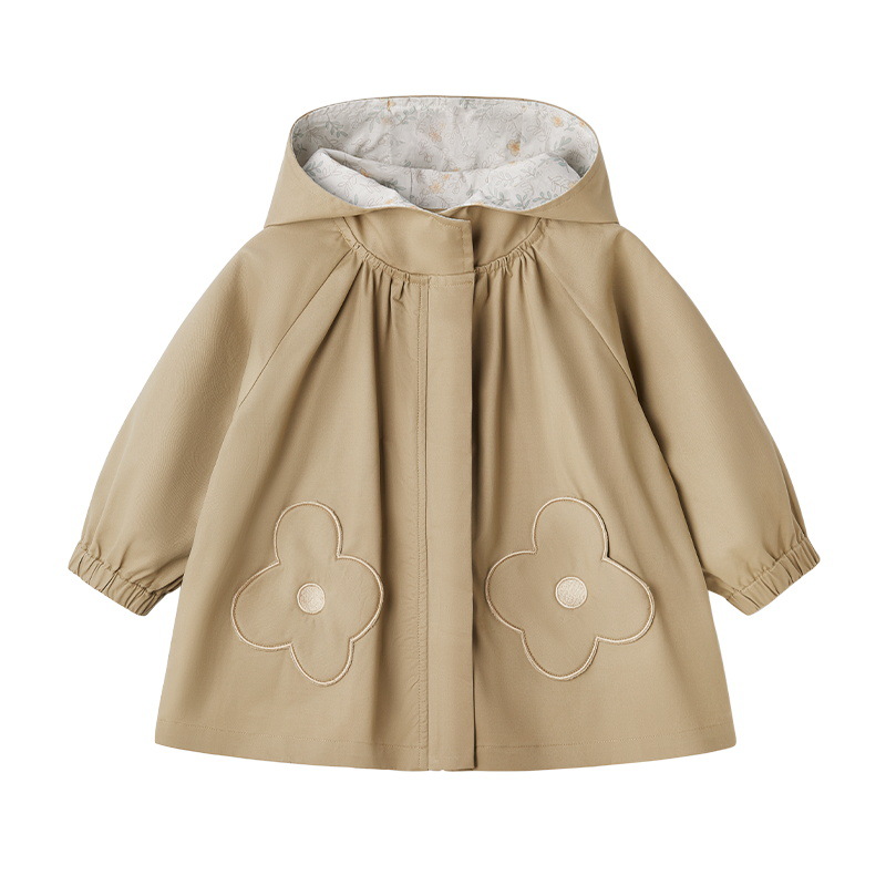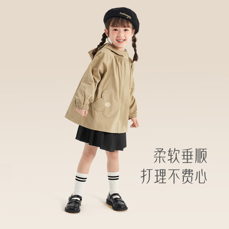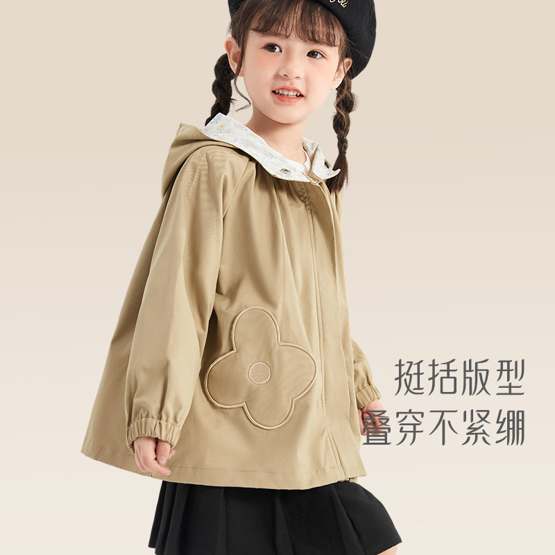 杰里贝比女童甜美卡其色风衣秋季新款小童中长款连帽宝宝全棉外套