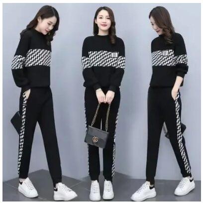 休闲运动撞色跑步两件套女2025春秋宽松大码圆领长袖卫衣卫裤套装