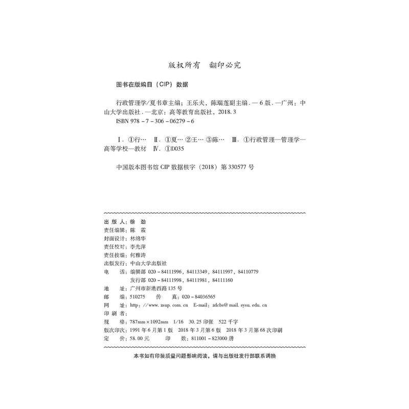 当当网正版 行政管理学 第六版第6版 夏书章 管理学基础课教材 考研考博复习教材 中山大学出版社