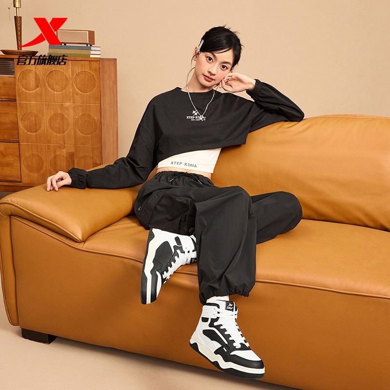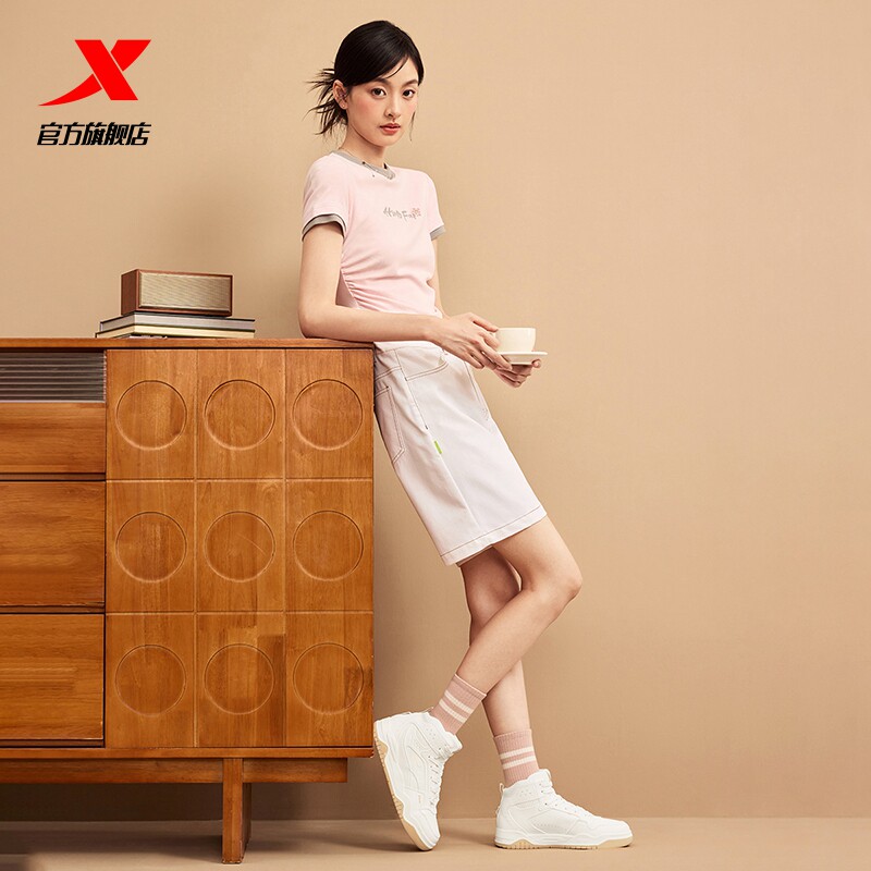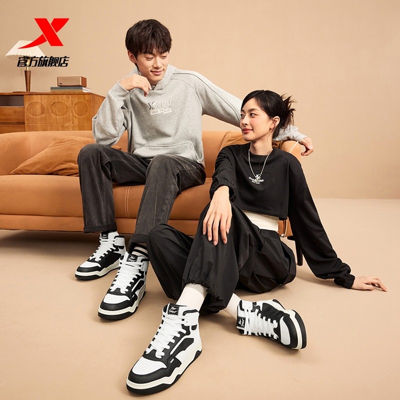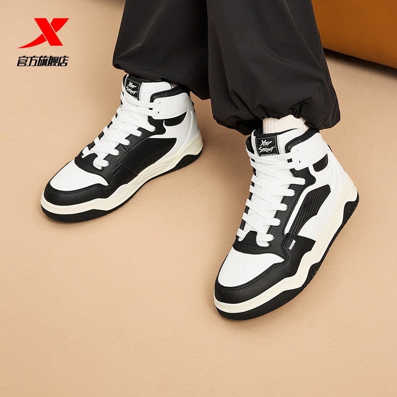 特步皓白高帮板鞋女鞋2025冬季新款休闲鞋运动鞋皮面软底保暖鞋子