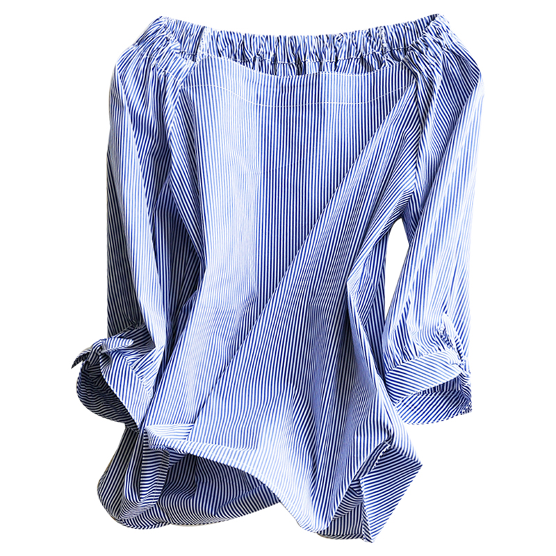 知性精炼 清爽百搭 弹力松紧领口蓝白竖条纹套头短袖衬衫宽松夏季